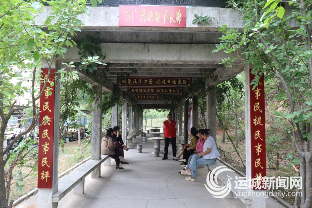 走进晋海花园小区(一期),“51”共融议事长廊格外引人注目。长廊两侧绿树成荫,居民们或一起打着扑克牌,或三三两两围坐在一起讨论着小区事务。