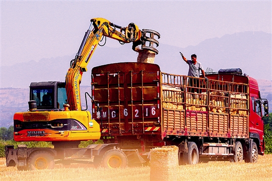 铲车伸出长臂将麦秸捆装入货车。 花雪红 摄