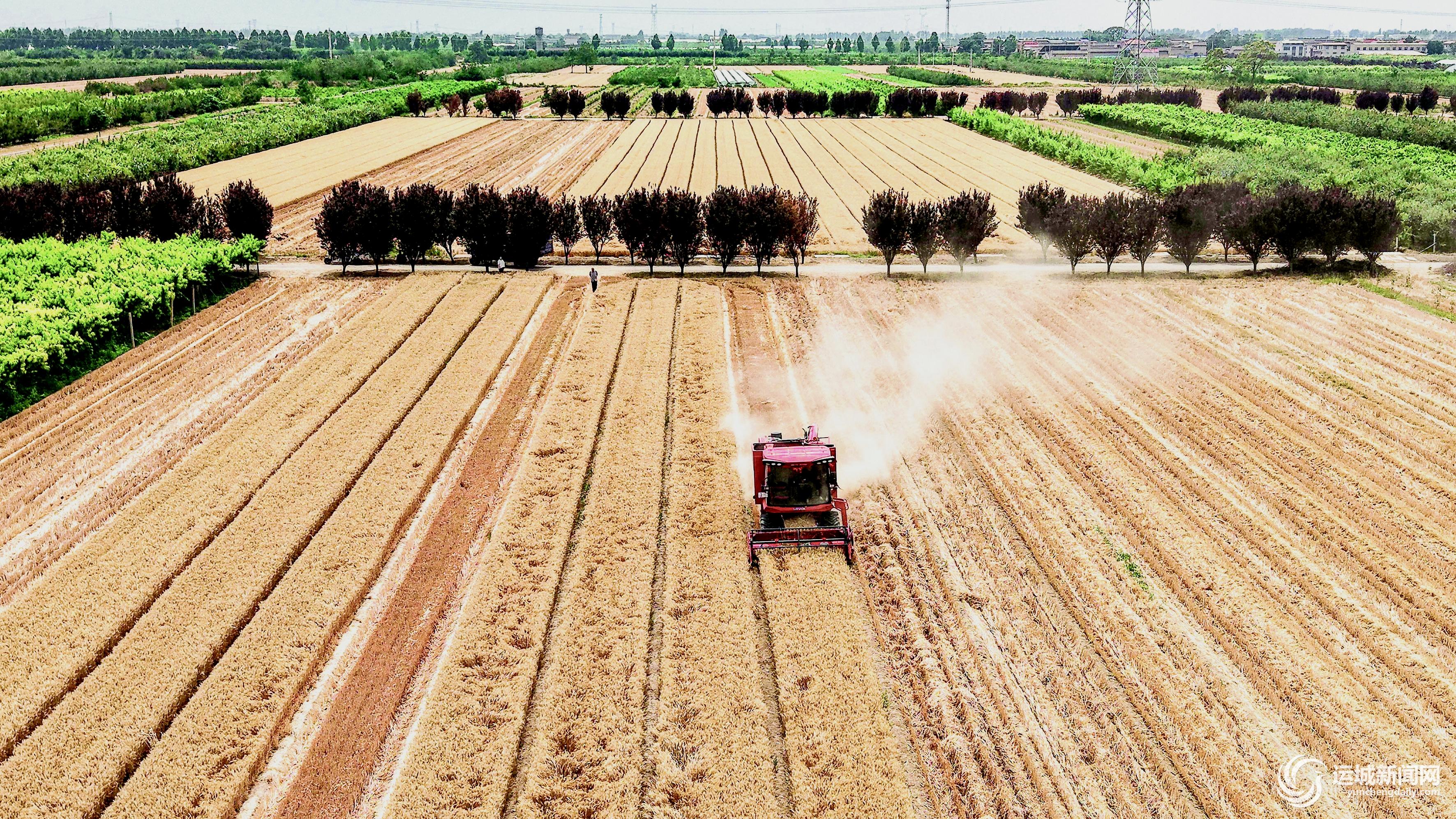 ▲临猗县嵋阳镇曹家营村充分依托土地资源优势,以党建为引领,以“集体办、集体干、集体管、集体花”为模式,创建了农机托管联合社。图为曹家营村农机联合社收割机在田中作业。