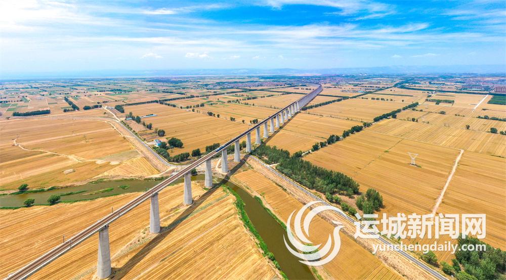 河津市黄汾百万亩粮食优质高产高效示范基地,饱满的麦穗压弯了麦秆,和着6月带着暖意的风,在空气中氤氲出阵阵麦香。大地铺金,明亮亮的黄色摄人心魄,宛如银带的汾河贯穿其中,列车驶过麦田,与整齐的村庄交相辉映,又一个丰收在望的美丽景象。