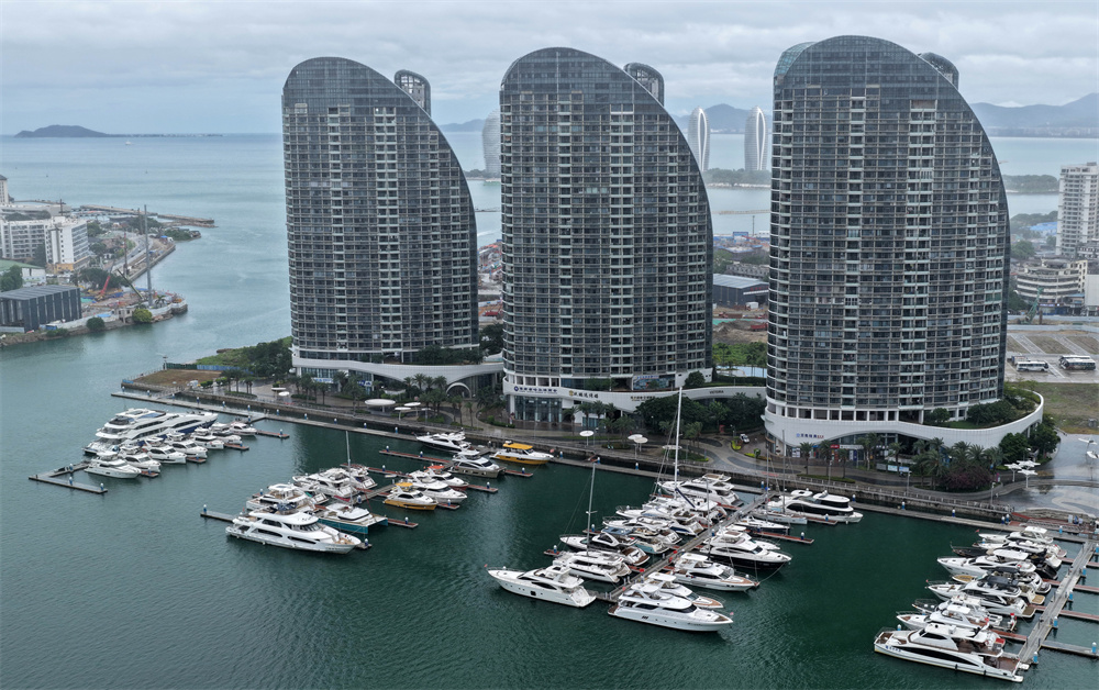 6月12日,受台风“蝴蝶”影响,游艇停泊在三亚市鸿洲游艇码头避风。