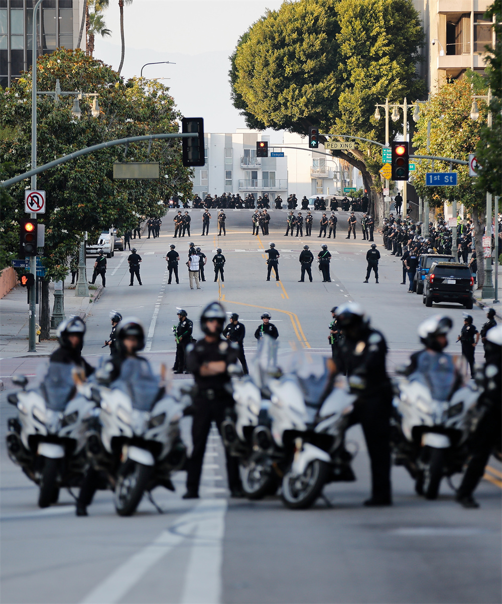 美国洛杉矶市街头抗议11日进入第六夜,警方在市中心等地点严阵以待,紧张气氛持续。洛杉矶警方当天证实,前一夜宵禁过程中逮捕200余人。洛杉矶市长巴斯11日傍晚宣布从当日晚8时至次日6时继续在市区实行宵禁。 新华社发