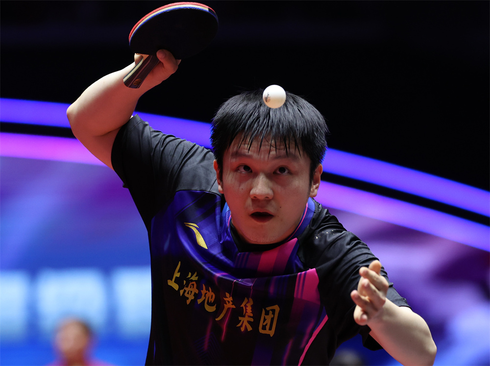 6月11日,上海地产集团队选手樊振东在比赛中发球。他在单打比赛中3比1战胜山东魏桥·向尚运动队选手黄友政。