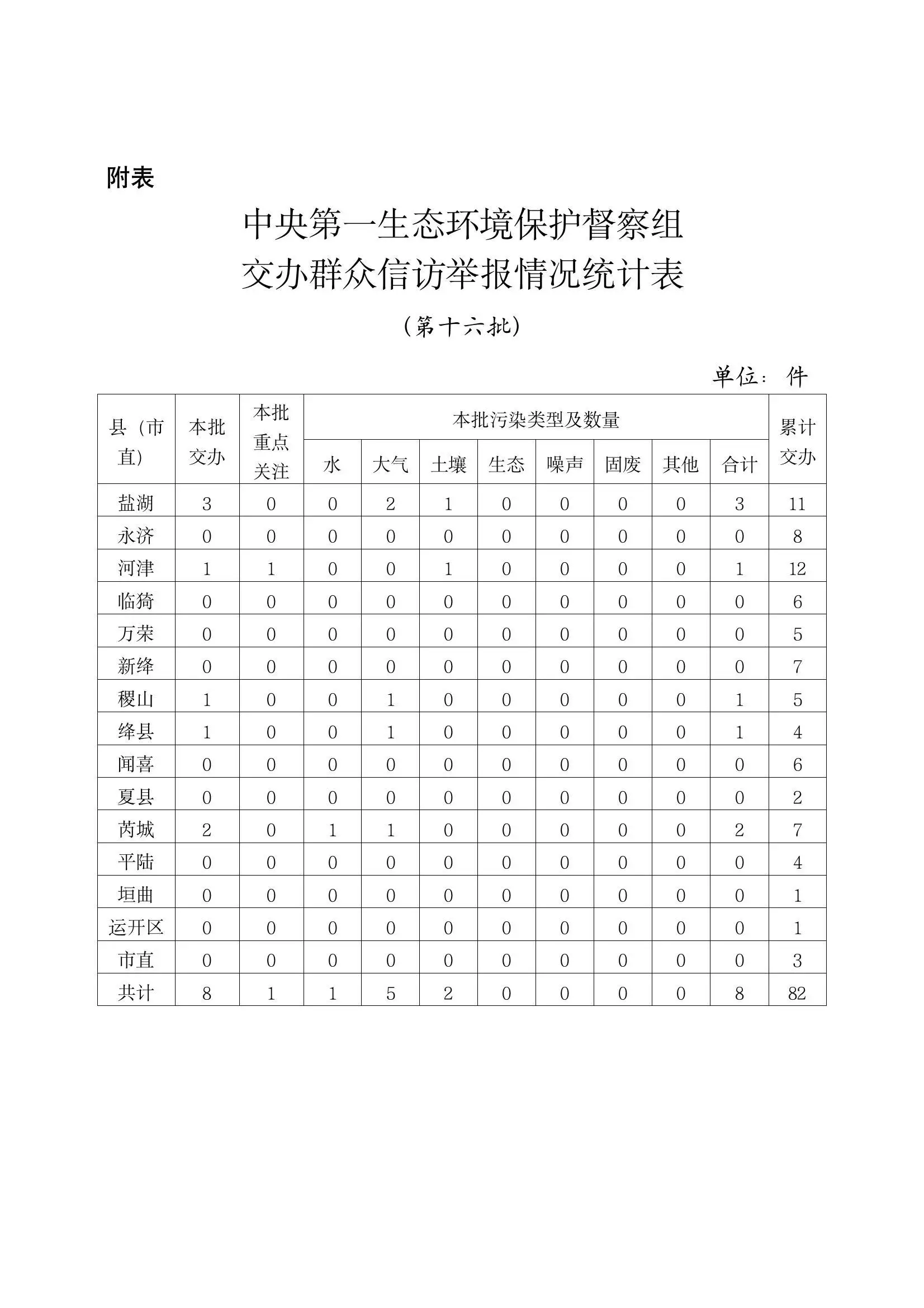 2025年6月13日,中央第一生态环境保护督察组向我市交办的第十六批信访举报件,共8件;交办举报件中重点关注件1件(河津市)。按区域和部门划分,盐湖区3件、河津市1件、芮城县2件、绛县1件、稷山县1件。本批转办的信访件,涉及生态环境问题8个,其中,水污染问题1个、大气污染问题5个、土壤污染问题2个。