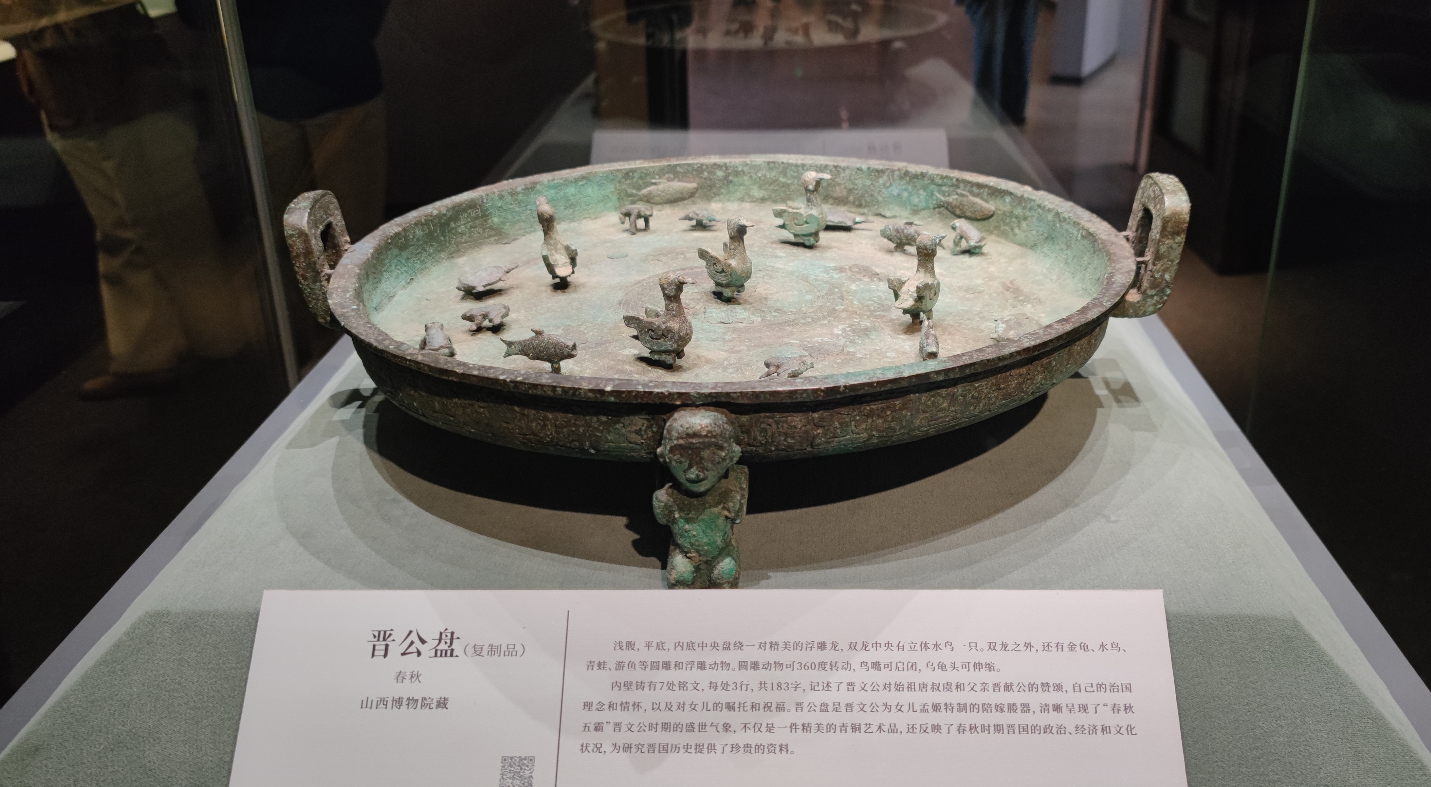 晋公盘器形雄浑多姿,工艺精湛,浅腹平底,内底中央饰有一对精美浮雕龙盘绕成圆形;双龙中央,有一只立体水鸟;双龙之外,还有四只立体水鸟和四只浮雕金龟;再向外延,又有三只圆雕跳跃青蛙和三条游鱼;最外圈,则有四只蹲姿青蛙、七只浮雕游泳青蛙和四只圆雕爬行乌龟。这些圆雕动物,都能作360度转动,鸟嘴可以启闭、乌龟首也可以伸缩。当水流倾泻而下,盘内的水鸟、游鱼、青蛙、乌龟都会旋转起来,俨然一个生机勃勃的夏日池塘。内壁七处铭文183字,追溯了晋国的先祖唐叔虞、晋文公的父亲晋献公开拓疆域、国运昌隆的功绩;赞颂了晋文公自己谨遵先祖遗训、建立显赫功业的雄图大略;最后,还表达了对女儿孟姬嫁到楚国以后,作为楚国国君的嫡妃,治理家室、捍卫晋国荣耀的期许。 (《太原日报》)