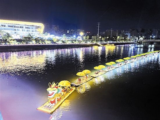 仲夏之夜的三门峡国际文博城南部区域流光溢彩,消夏晚会、夜市、游乐区等吸引大量市民游客前来观看演出、享受美食、休闲游玩。图为6月14日晚,市民游客泛舟河上,在习习微风中欣赏水岸风光,清凉而又惬意。 本报记者 张勤才 摄