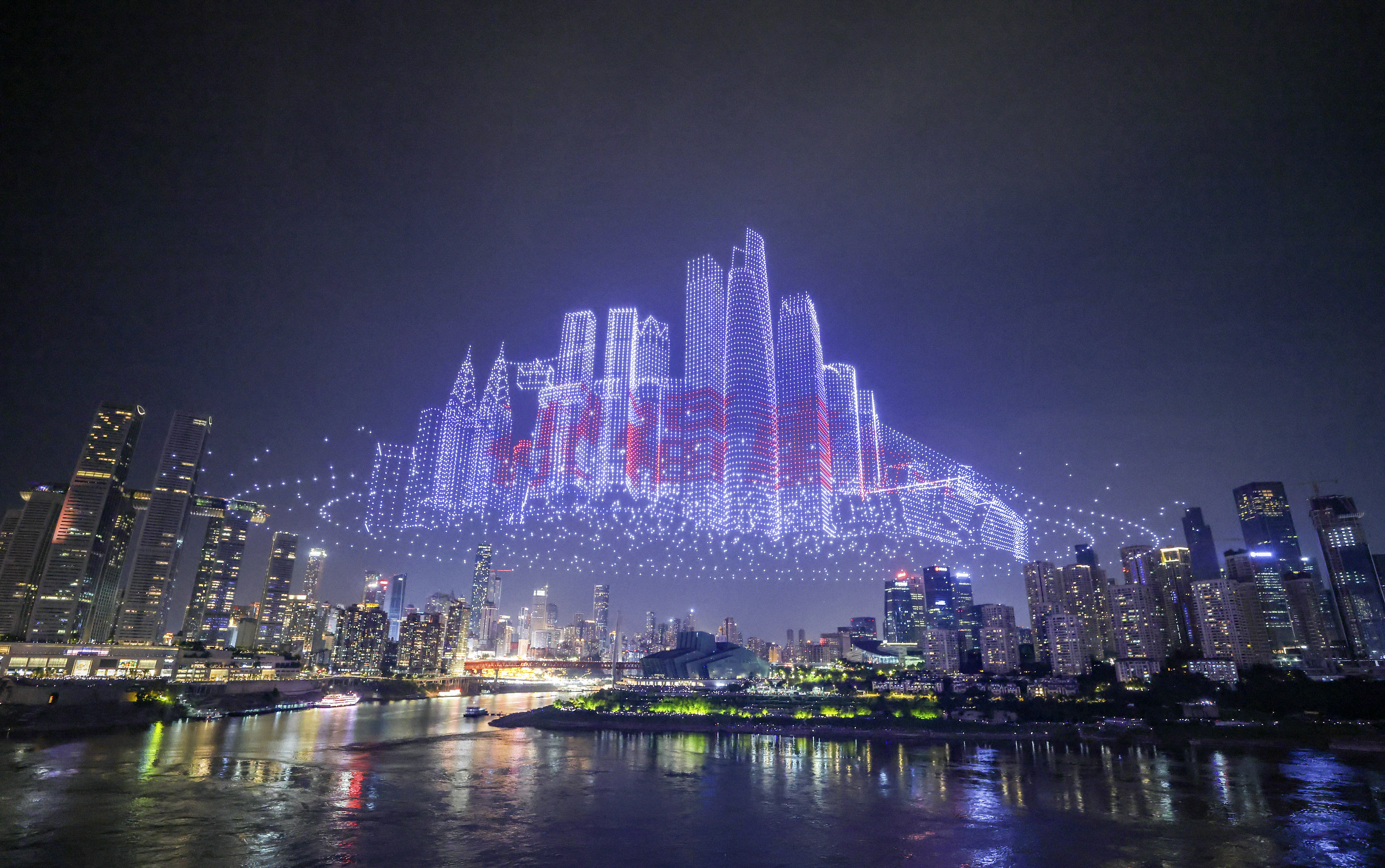 6月17日晚,重庆举行超大规模无人机灯光秀表演,由11787架无人机组成的双编队飞行从重庆市南岸区弹子石广场起飞,创造了“最多无人机组成的空中图案”吉尼斯世界纪录。