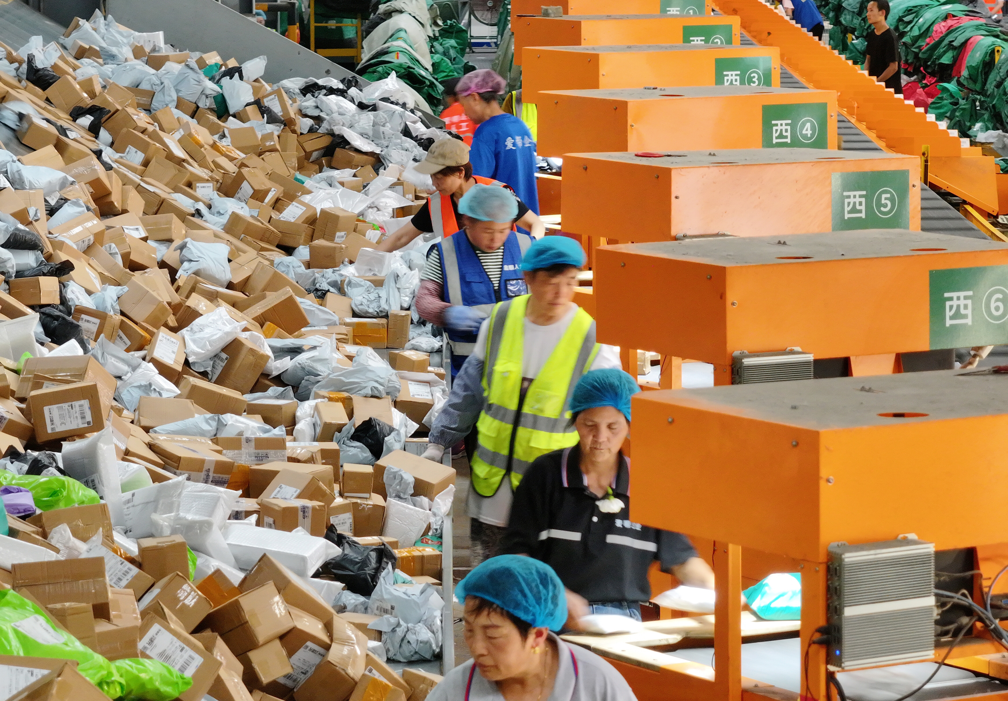 6月17日,中国邮政集团有限公司扬州邮件处理中心工作人员在分拣快递。