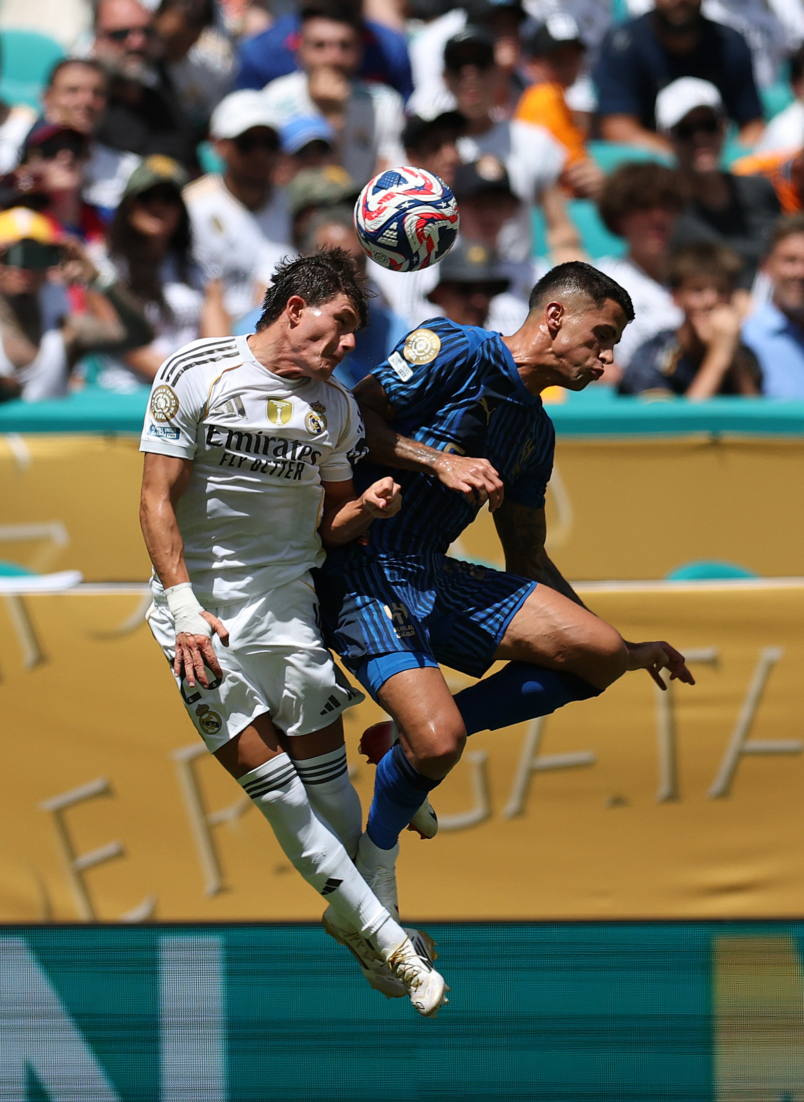6月18日,皇家马德里队球员弗兰·加西亚(左)与利雅得新月队球员坎塞洛在比赛中争顶。 当日,在美国迈阿密进行的2025年国际足联俱乐部世界杯(世俱杯)H组小组赛中,西班牙皇家马德里队1比1战平沙特利雅得新月队。 新华社记者 李明 摄