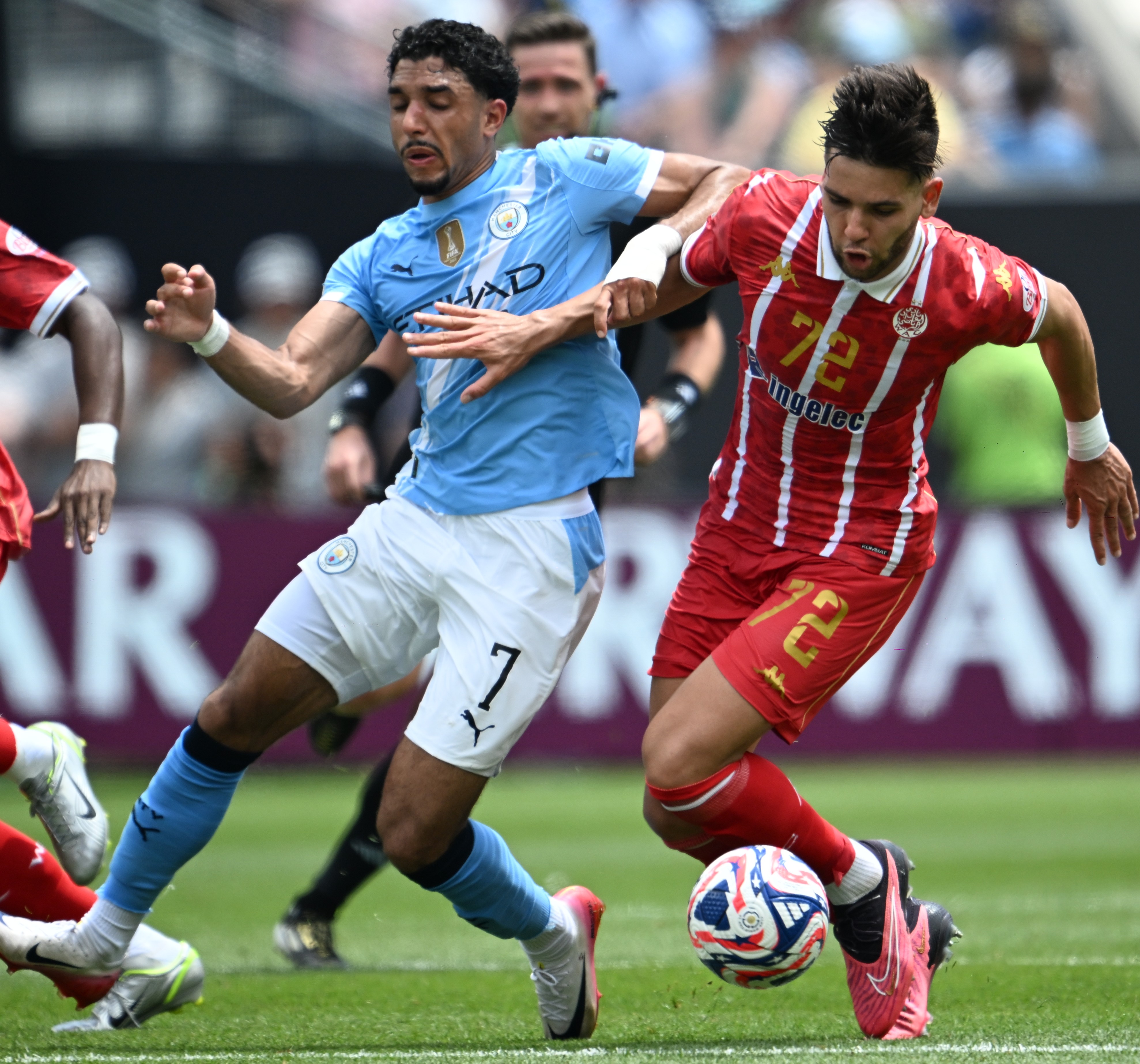 6月18日,曼彻斯特城队球员马尔穆什(左)与卡萨布兰卡达维达德队球员吉列尔梅·费雷拉在比赛中拼抢。 当日,在美国费城举行的2025年国际足联俱乐部世界杯(世俱杯)小组赛G组比赛中,英格兰曼彻斯特城队2比0战胜摩洛哥卡萨布兰卡维达德队。 新华社记者 吴晓凌 摄