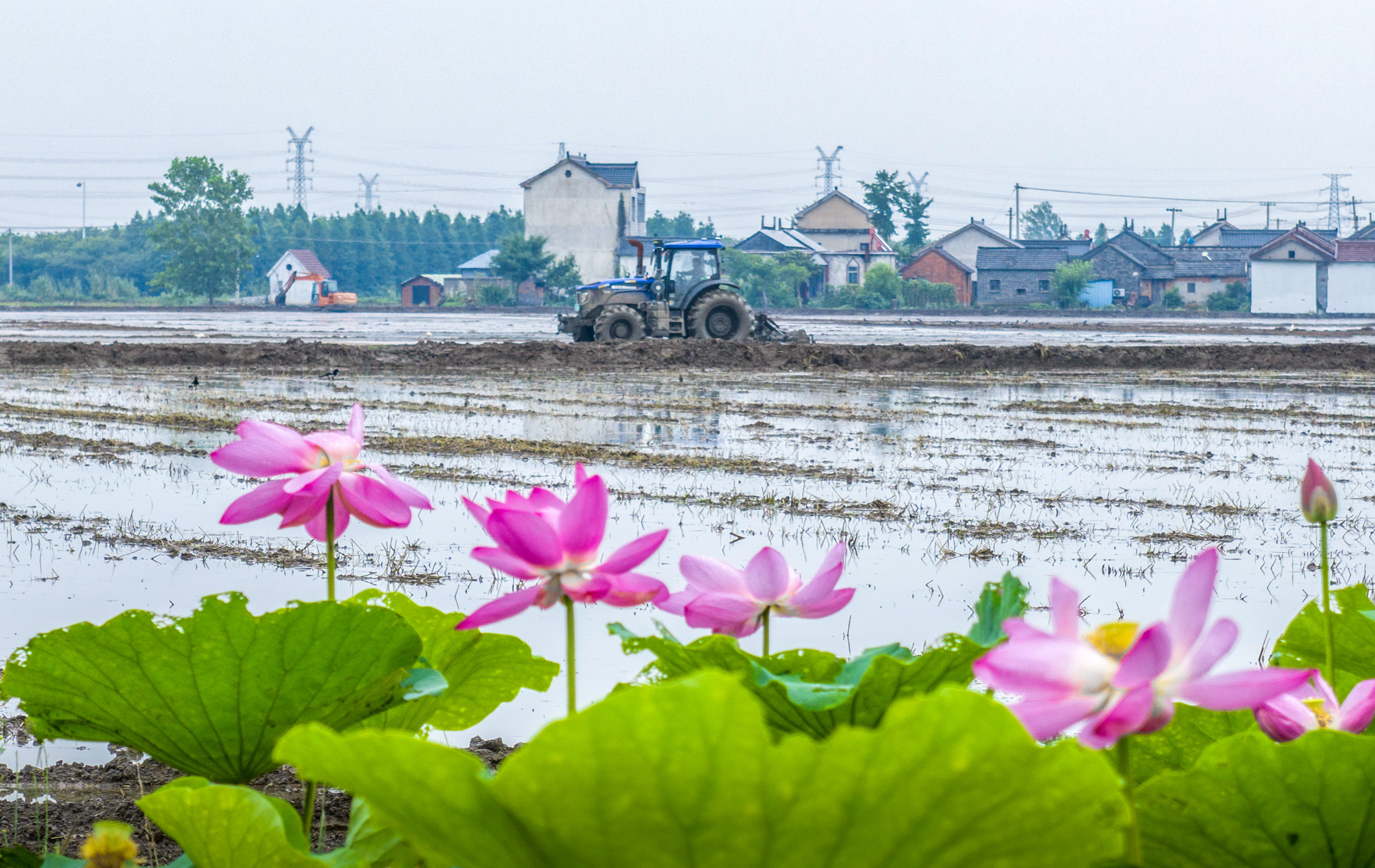 6月20日,在江苏省兴化市陈堡镇四林村,农民冒雨在田间耕地。 新华社发(周社根 摄)