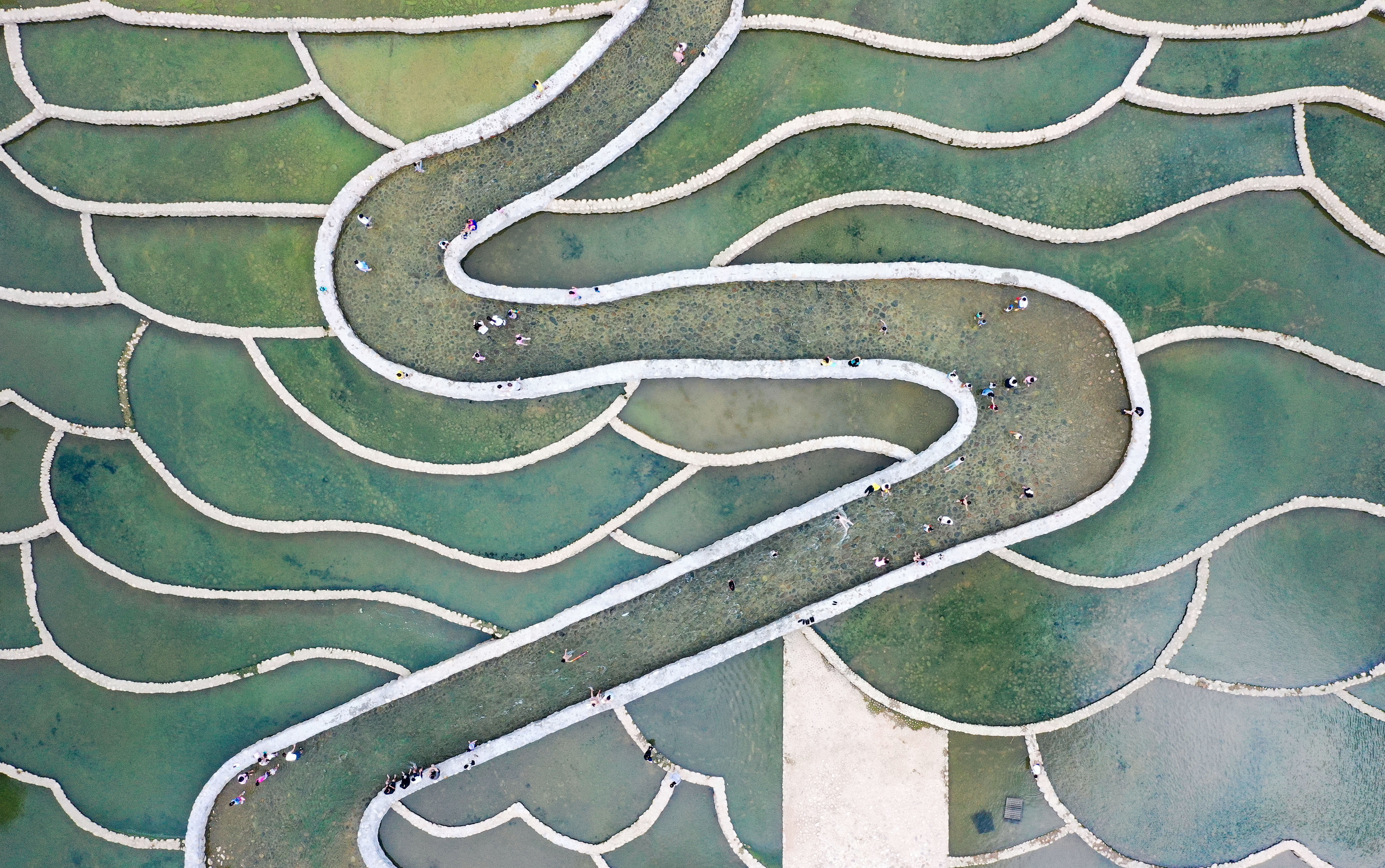 近日,市民和游客在海南省五指山市小岛公园鱼鳞坝游玩。