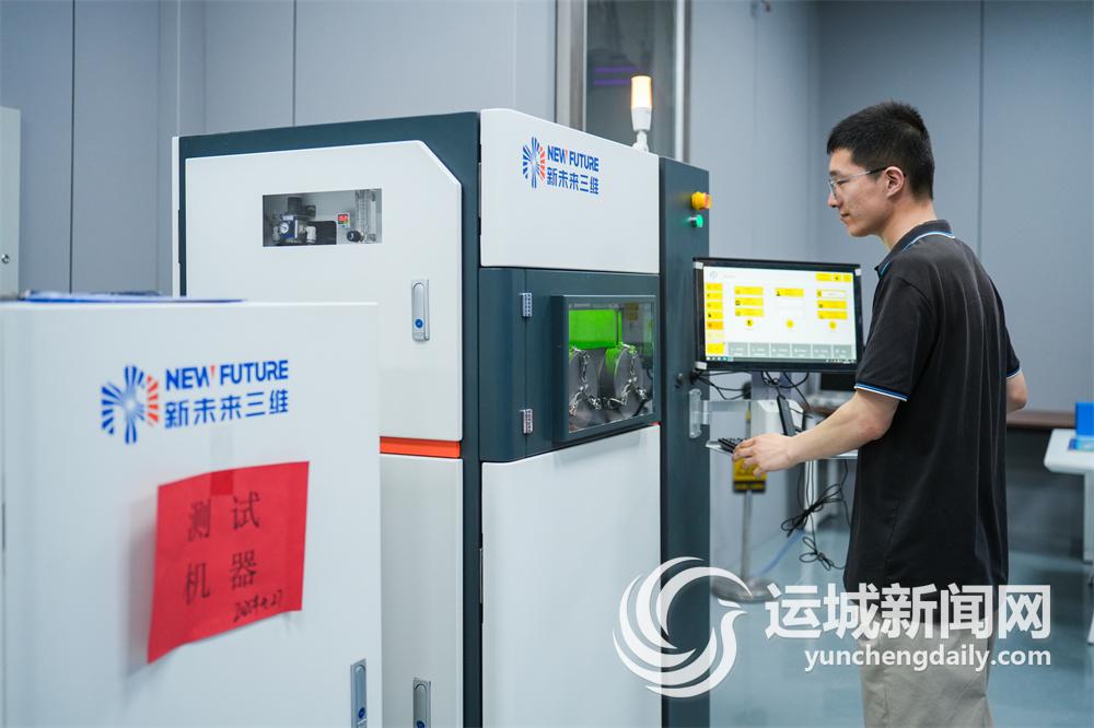 运城,运城联袂医疗科技有限公司内,生产负责人刘博正与3D打印设备供应商一起测试新设备性能;