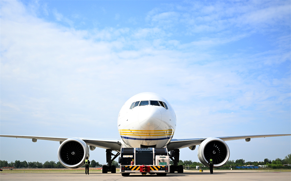 6月23日,中国邮政郑州至卢森堡国际货运航线首航货机在郑州新郑国际机场做起飞前的准备。