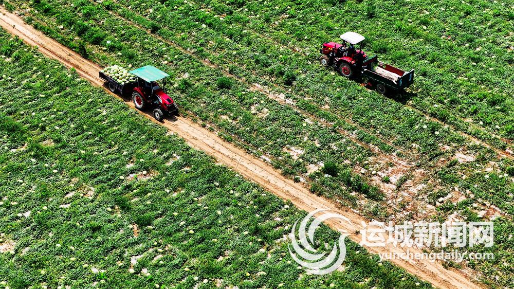 万荣县黄河滩5000余亩西瓜喜获丰收,瓜农们加紧采收,供应市场(6月22日摄)。