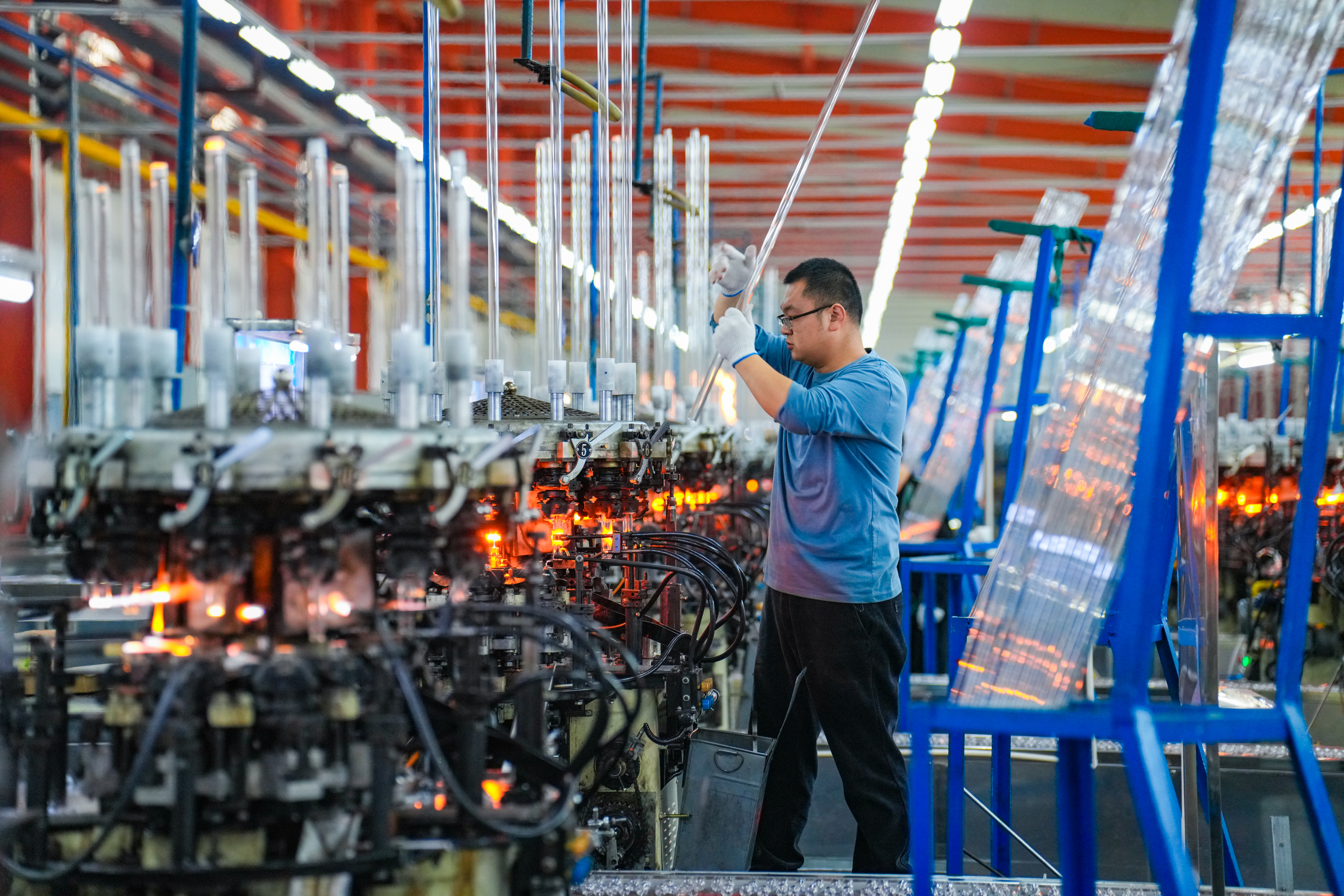 位于芮城县的山西宏光医用玻璃股份有限公司生产车间,工人在生产管制瓶产品。