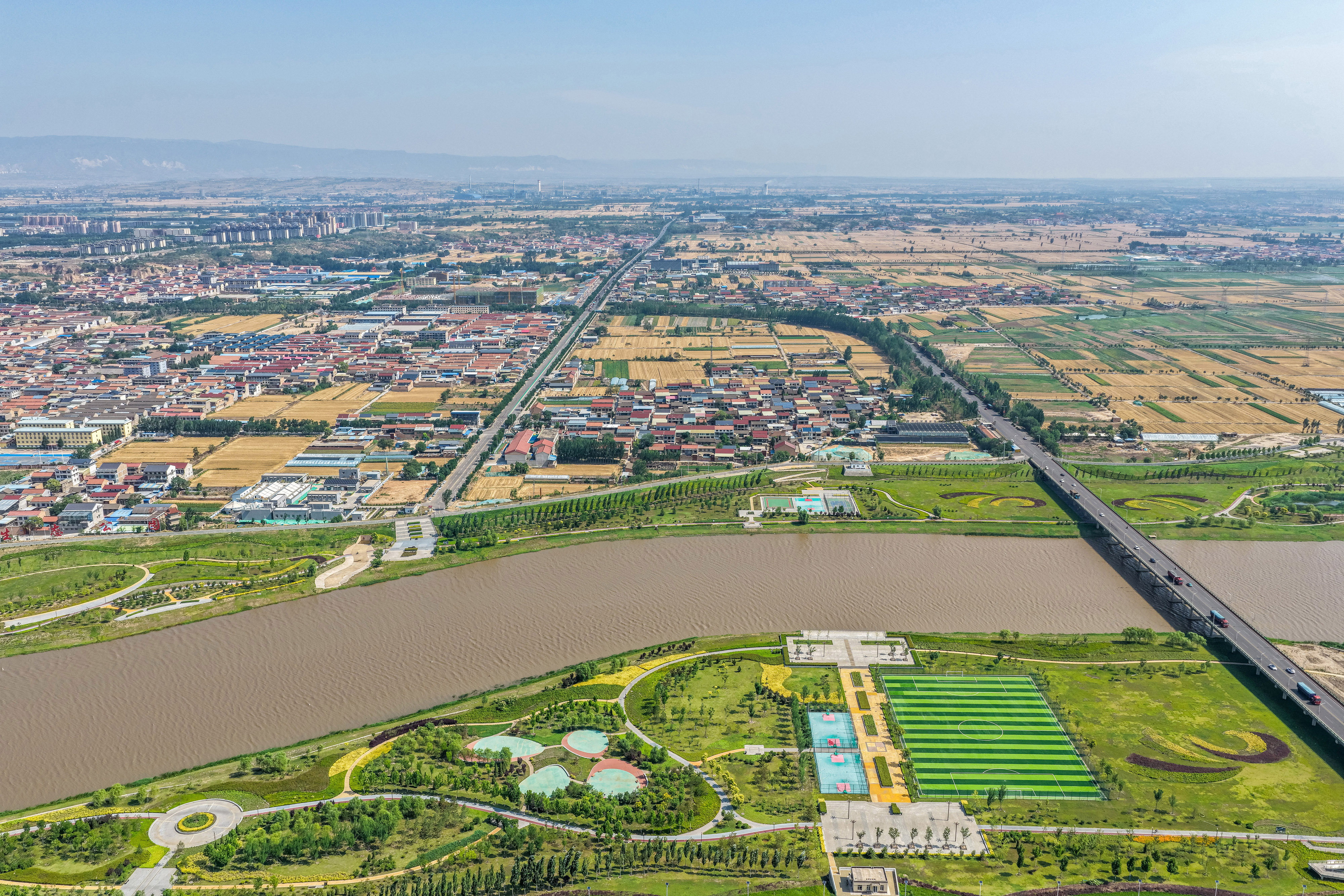 垣曲县境内黄河岸旁公路蜿蜒,农田点缀,尽显雄浑与灵秀。