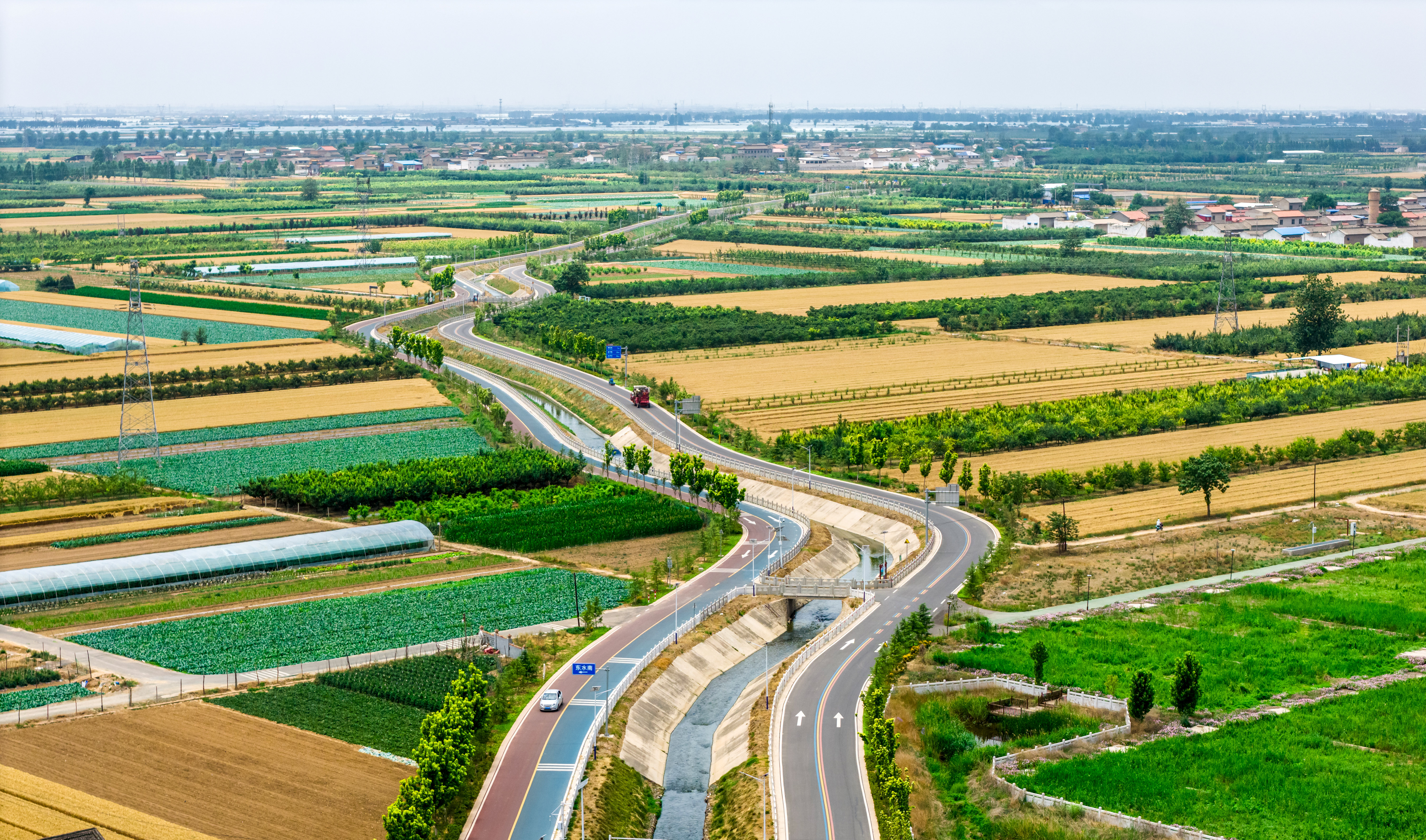 临猗县沿涑水河田园风光示范带与公路交错,呈现出现代农业诗意交响。
