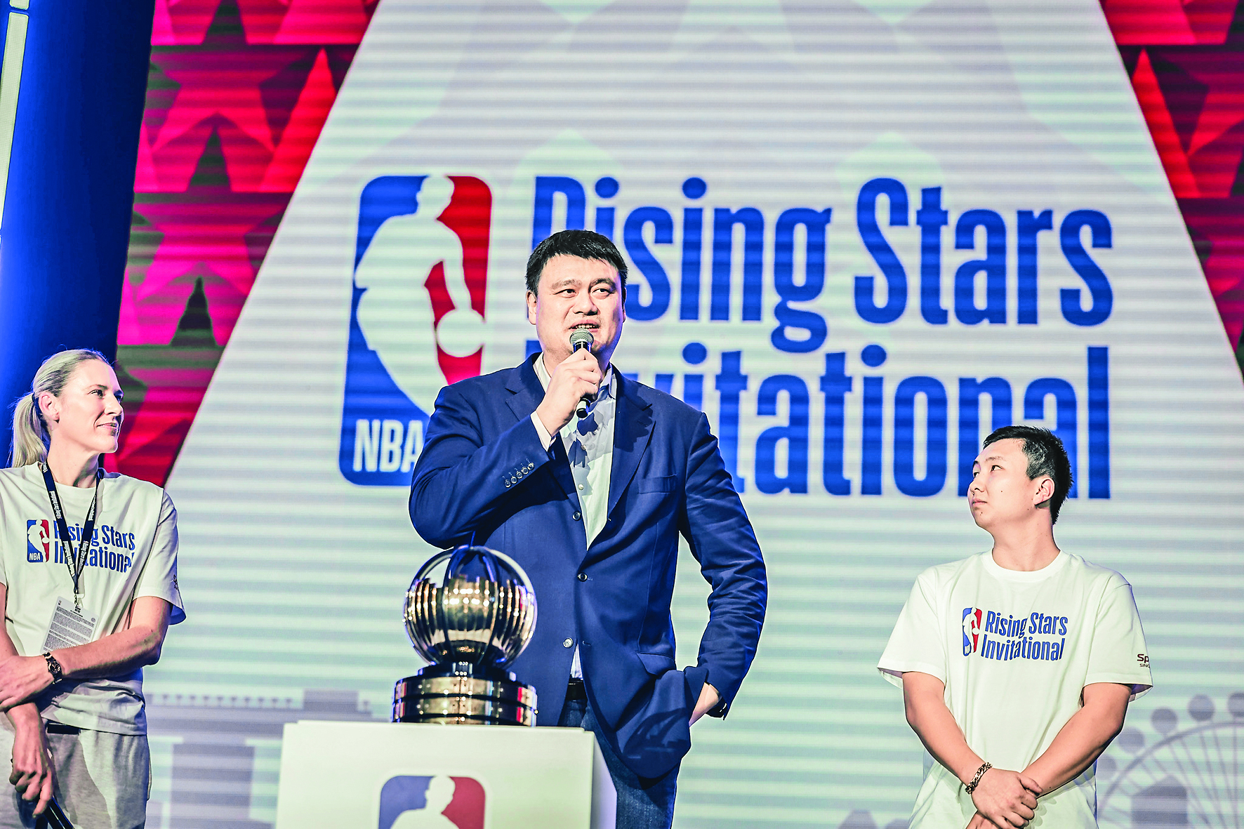 6月25日,姚明(中)在开幕式现场致辞。 当日,由美国职业篮球联盟(NBA)主办的首届NBA未来之星邀请赛在新加坡开幕。
