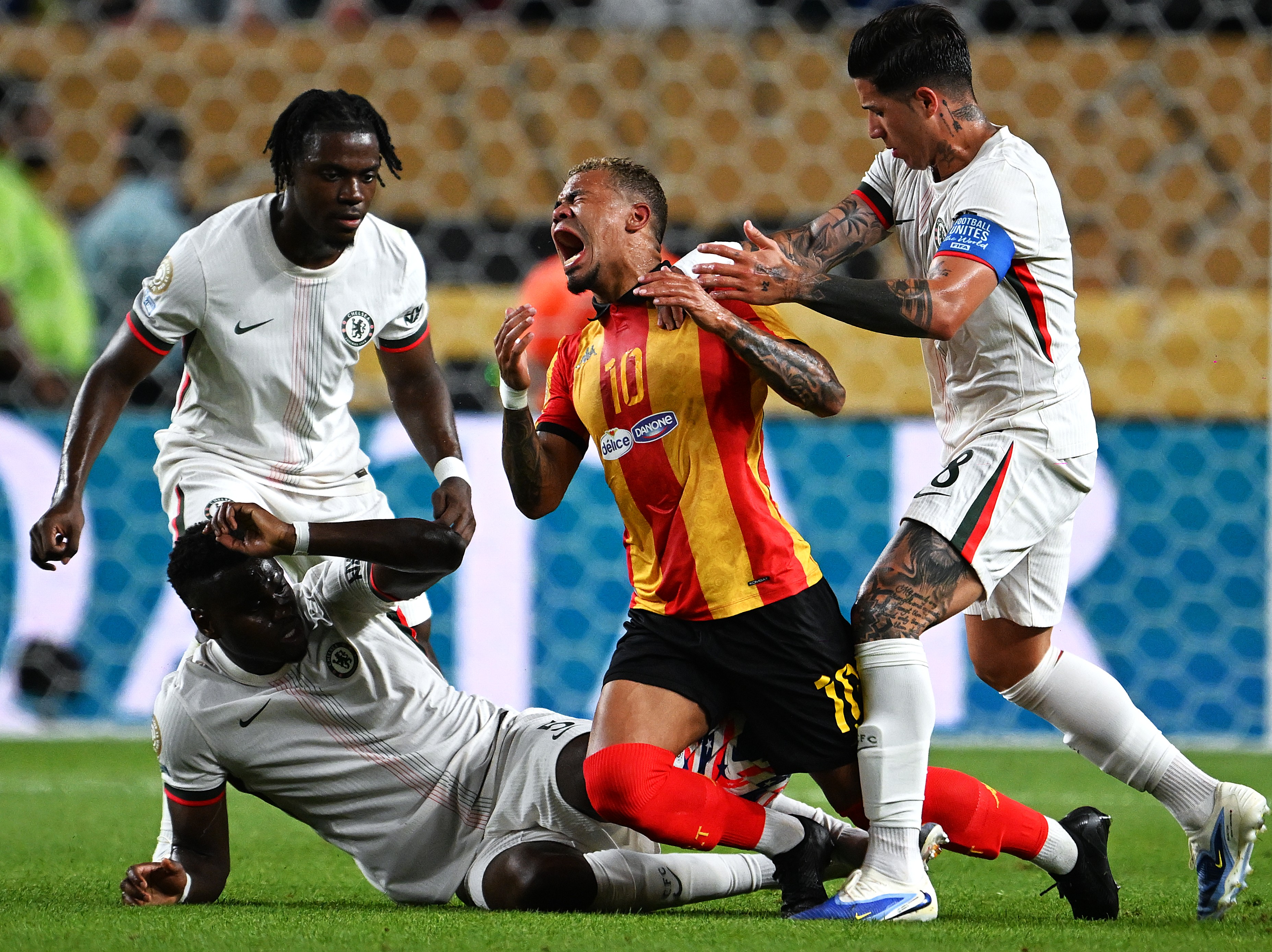 6月24日,切尔西队球员巴迪亚西勒(下)在比赛中铲断突尼斯希望队球员扬·萨瑟(右二)。 当日,在美国宾夕法尼亚州费城举行的2025年国际足联俱乐部世界杯(世俱杯)小组赛D组比赛中,英格兰切尔西队3比0战胜突尼斯希望队,晋级淘汰赛。 新华社记者