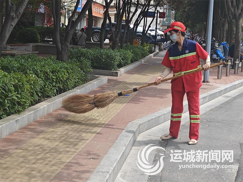 翟兰芳负责中心城区河东东街市妇幼保健院附近300米区域的卫生清洁工作。这里商铺较多,顾客进进出出;医院门口人潮熙攘,往来行人步履匆匆;一旁的游园偶尔也有路人穿梭。密集的人流带来了较多垃圾,而道路两旁的柳树与女贞树也没让她“省心”。枯黄的柳叶打着旋儿,女贞树的花瓣簌簌坠地,给清洁工作增添了不小难度。