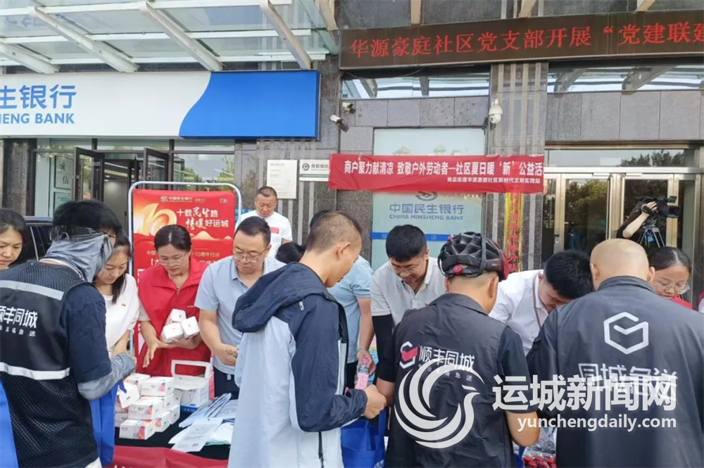 “师傅,天太热了,快进来歇会儿,喝口水,领份防暑礼包!”6月16日上午8时,盐湖区姚孟街道华源豪庭社区“党建联建聚合力·夏日暖‘新’送清凉”活动现场,工作人员热情地招呼着往来的户外劳动者。红色横幅在热浪中飘扬,桌上整齐摆放着防暑帽,以及装满藿香正气液、风油精、冰袖等物品的“清凉礼包”。随着日头升高,身着橙色环卫服的工人、骑着电动车的外卖员陆续前来。