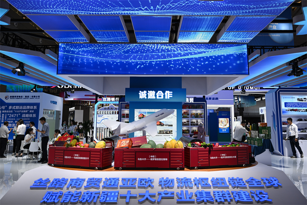 6月26日,在2025(中国)亚欧商品贸易博览会现代物流、低空经济展区,新疆商贸物流(集团)有限公司展台展示多条跨境物流项目。