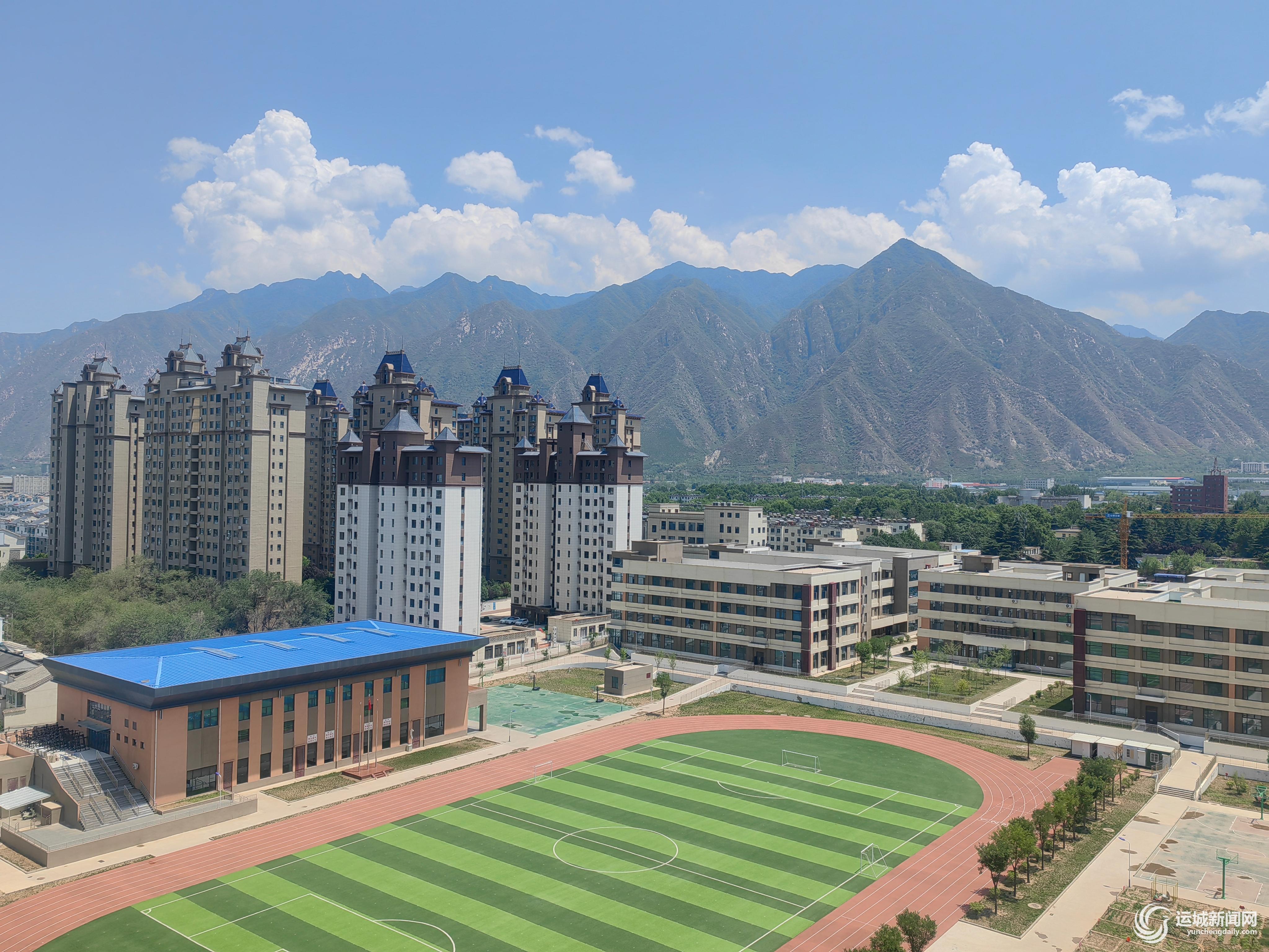 6月28日,永济市城区的蓝天、白云、青山和现代化的高楼及体育场遥相呼应,共同绘制出一幅山城相依的美好画卷。