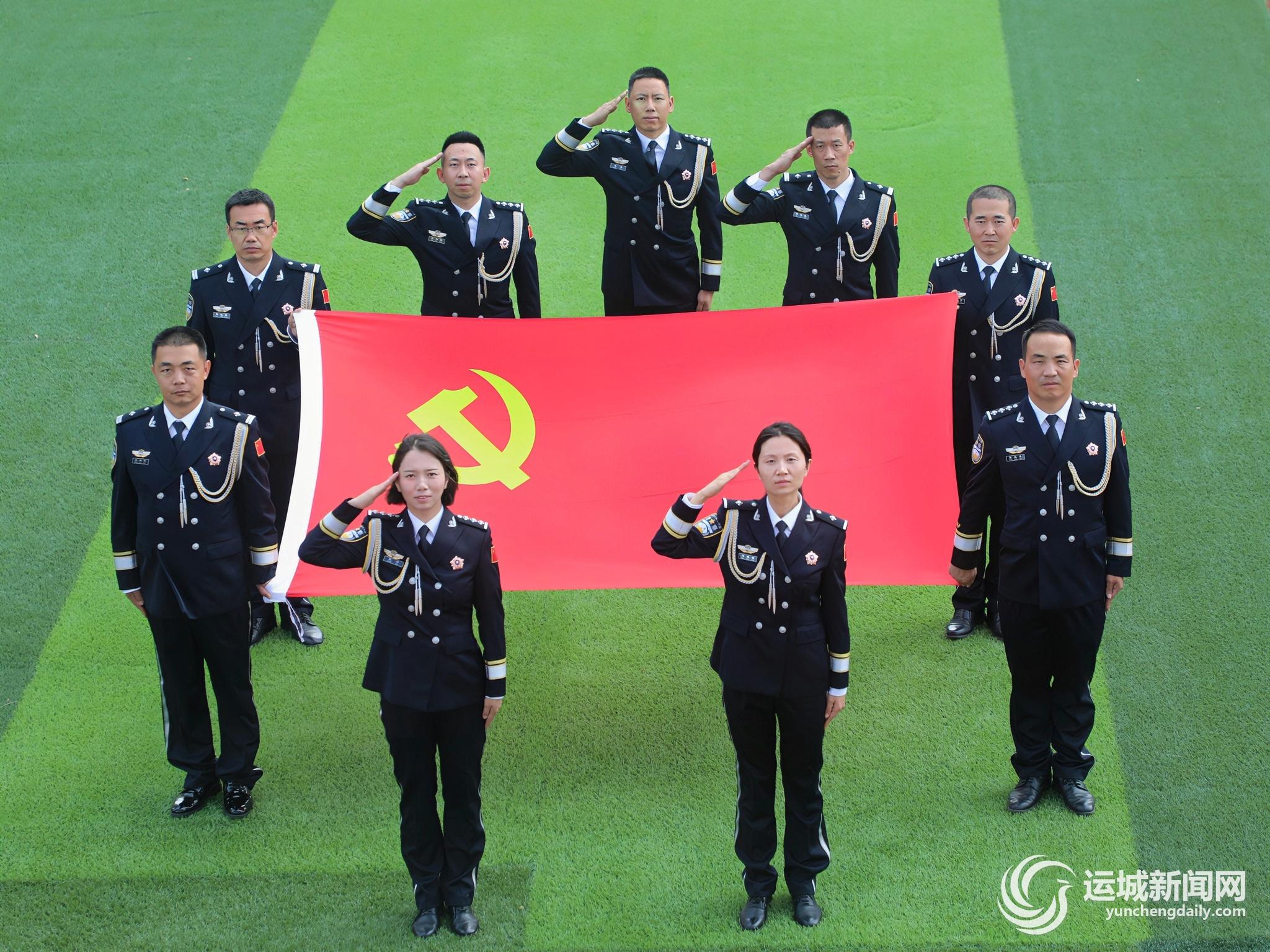 在运城边检站组织开展的“初心映党旗·奋进新征程”主题党日活动中,党员民警怀着激动与崇敬的心情,身穿警礼服,整理好仪容仪表,围绕党旗均匀站立,向着首都方向,致以标准敬礼,以昂扬的姿态表达出对党的忠诚与祝福,展现了新时代移民管理警察奋发进取、昂扬向上的良好精神风貌。