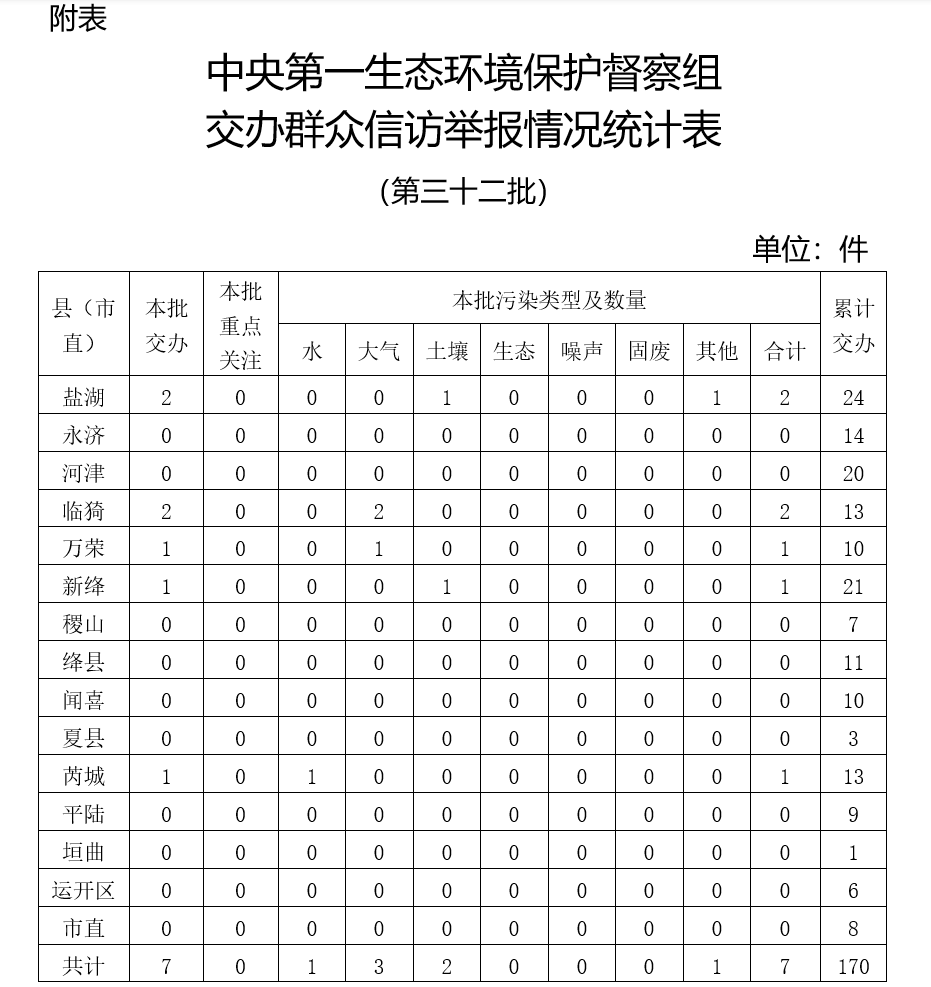 2025年6月29日,中央第一生态环境保护督察组向我市交办的第三十二批信访举报件,共7件;交办举报件中重点关注件0件。按区域和部门划分,盐湖区2件、临猗县2件、万荣县1件、新绛县1件、芮城县1件。本批转办的信访件,涉及生态环境问题7个,其中,水污染问题1个、大气污染问题3个、土壤污染问题2个、其他污染问题1个。