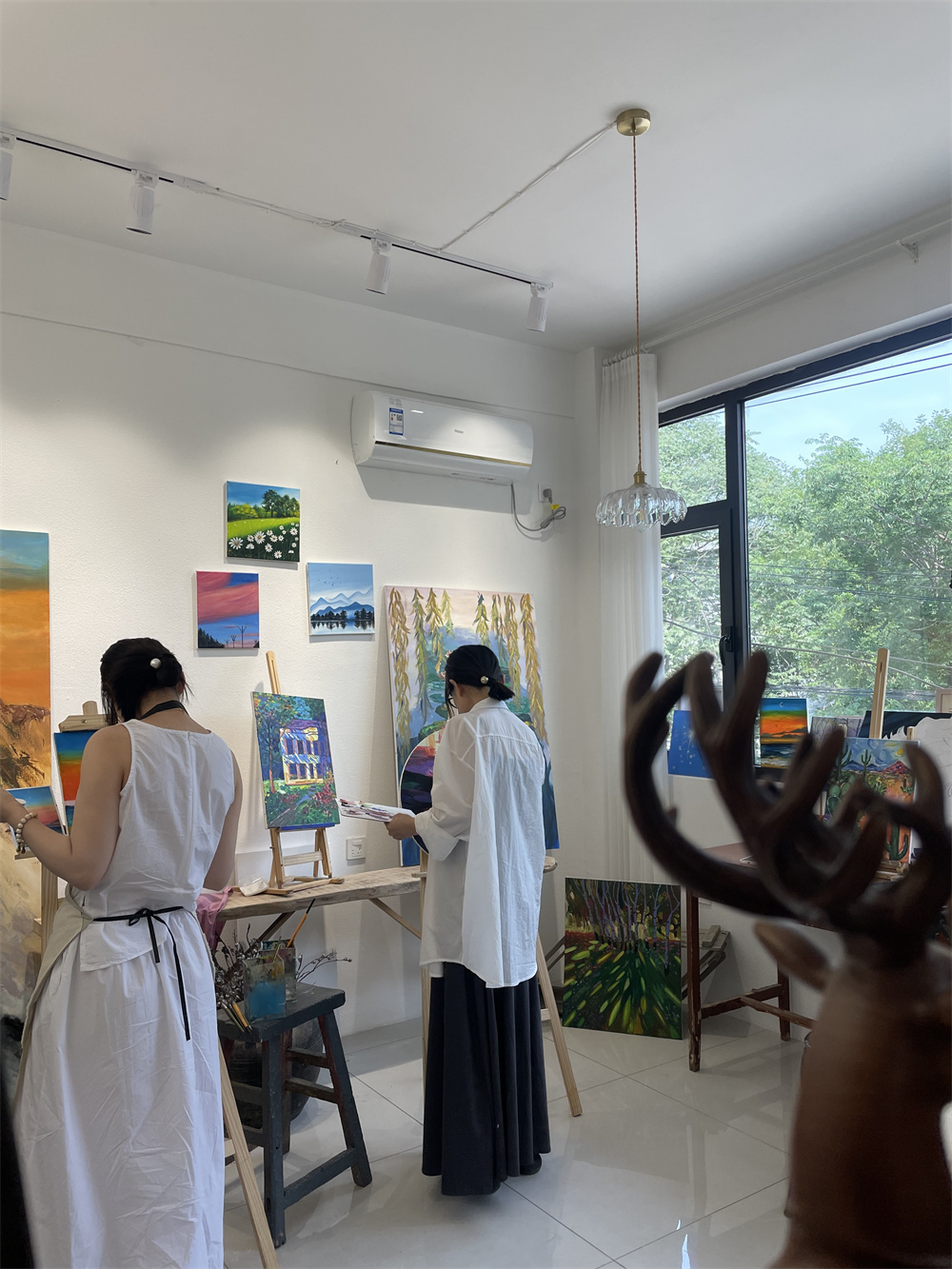南熙的艺术背景为画室注入了深厚的底蕴。从小学习绘画的深厚功底及不断学习的生活态度让她在绘画这条道路上可以越走越远。而且她坚信艺术的价值不在于技法的高低,而在于能否与人心产生共鸣。因此,在运营中,南熙坚持“指导而非教学”的模式,只教授基础油画打底等简单技法,让学员在自由创作中感受成就感。