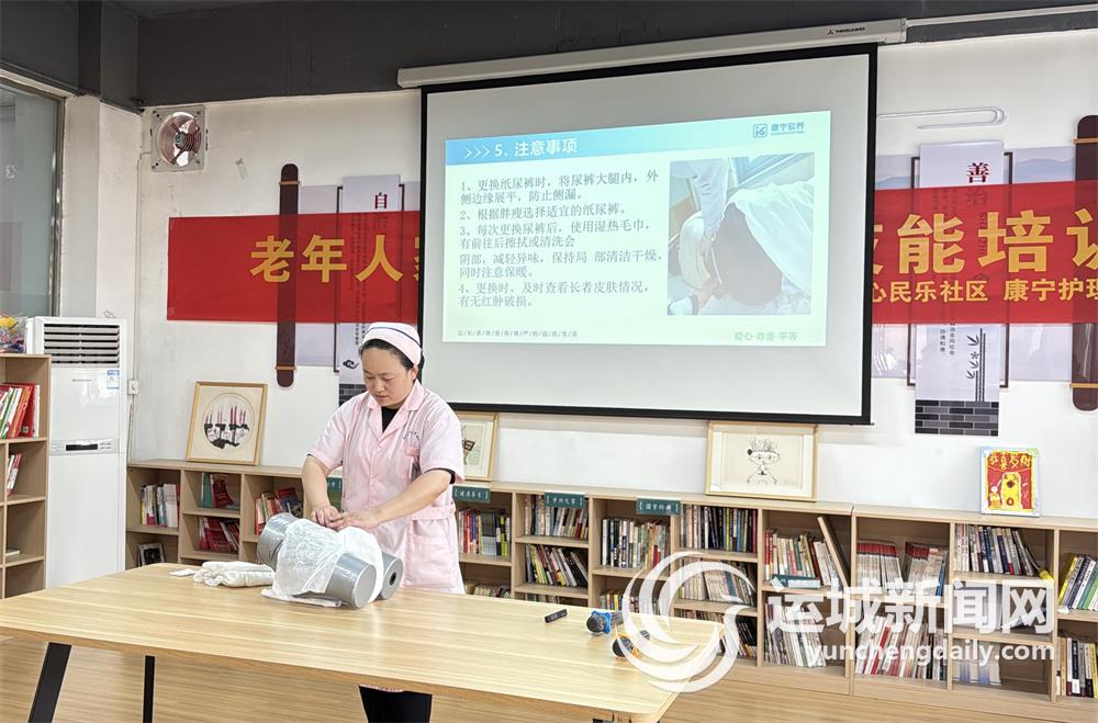 另一方面,开展家庭成员照护技能培训。康宁护理院的李秋霞护士长通过理论讲解与实操演示相结合的方式,向居民传授了如何更换纸尿裤的护理知识,主要包括操作流程、注意事项等(上图)。居民们认真学习、积极提问。不少居民表示,参加这次培训收获很大。