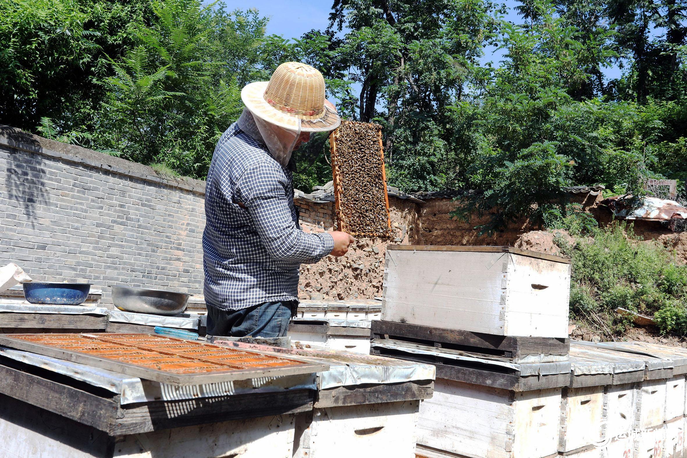7月4日,垣曲县新城镇左家湾村蜂农在蜂场查看蜜蜂产蜜情况。