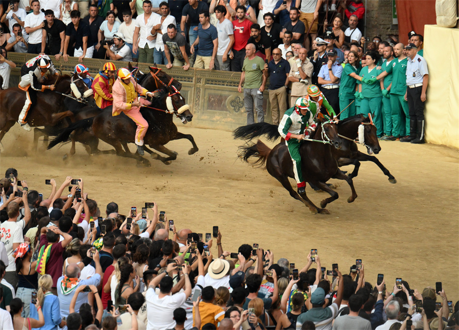 当日,锡耶纳赛马节在意大利托斯卡纳大区古城锡耶纳市中心的田野广场举行,吸引了众多观众前来观看。锡耶纳赛马节是世界闻名的意大利传统民间活动,始于1656年,每年7月和8月举行两次。