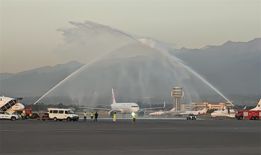 7月4日,在哈萨克斯坦阿拉木图国际机场,东方航空公司上海至阿拉木图直飞航线客机穿过象征民航最高礼仪的“水门”。当地时间4日晚7时15分,从上海浦东国际机场起飞的MU6041航班平稳降落在哈萨克斯坦阿拉木图国际机场,标志着中国东方航空公司上海至阿拉木图直飞航线正式开通。 新华社发