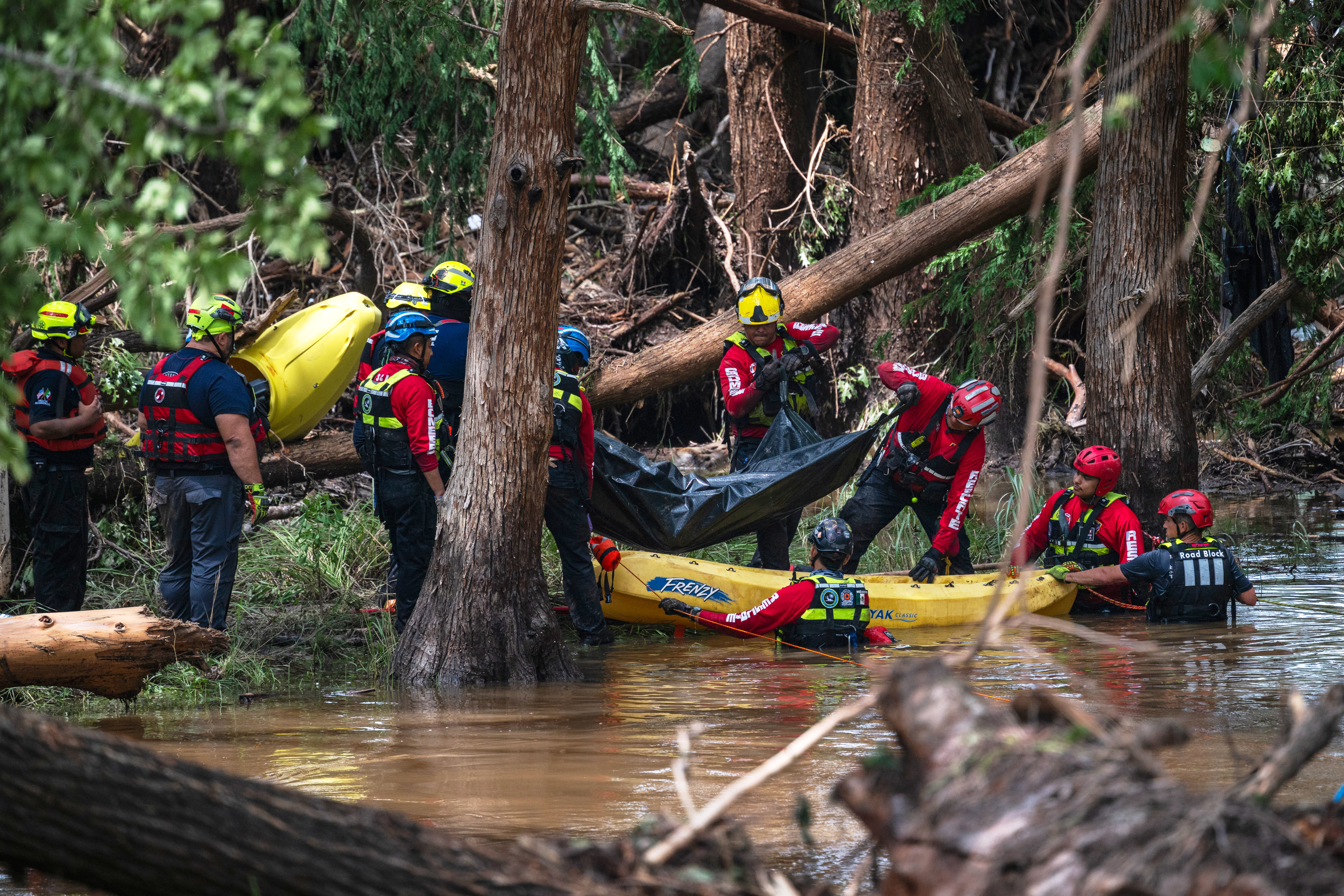 7月7日,救援人员在美国得克萨斯州英格勒姆遭洪水侵袭的区域搬运遇难者的遗体。
