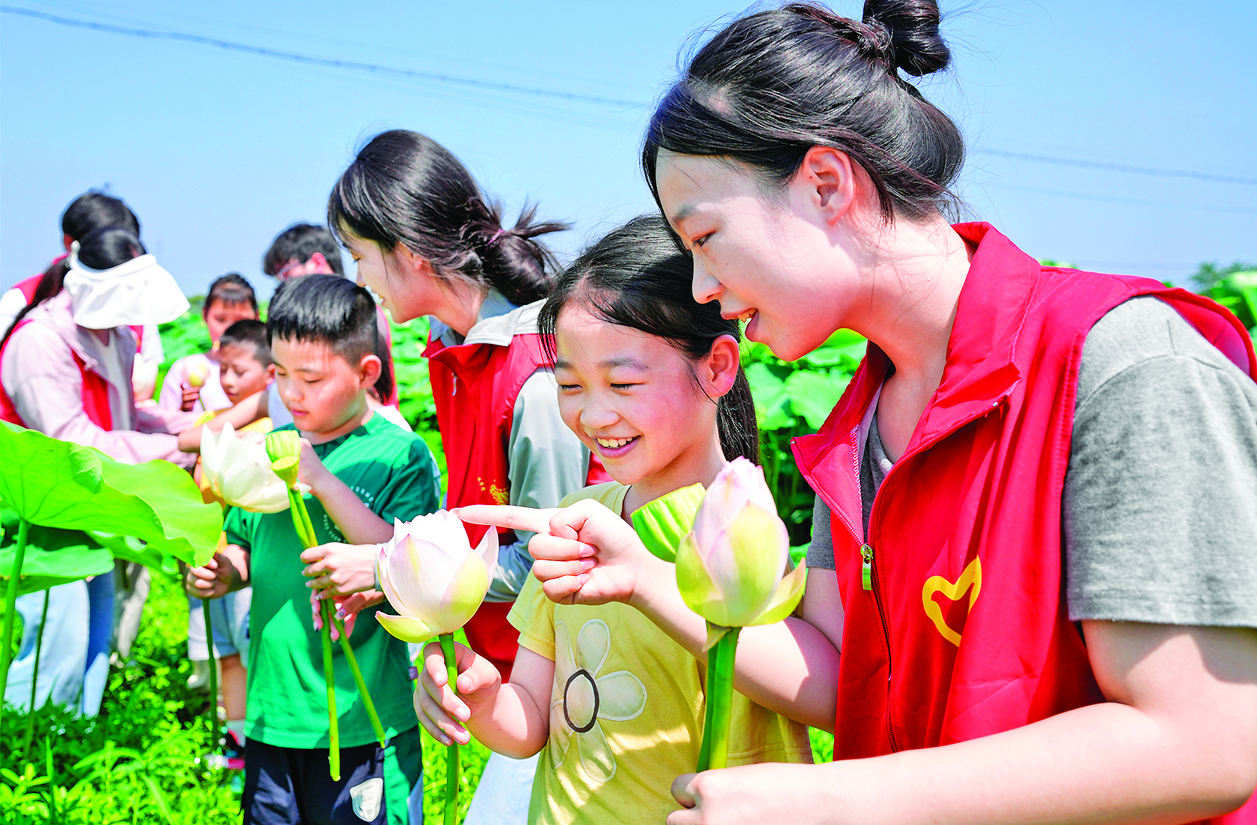 7月7日,在江苏省海安市墩头镇千步村,南京工业大学建筑学院大学生志愿者在浅水藕田边教小学生认识荷花和莲蓬。 暑假期间,大学生志愿者辅导孩子们参加丰富多彩的活动,充实假期生活。 新华社发(周 强 摄)