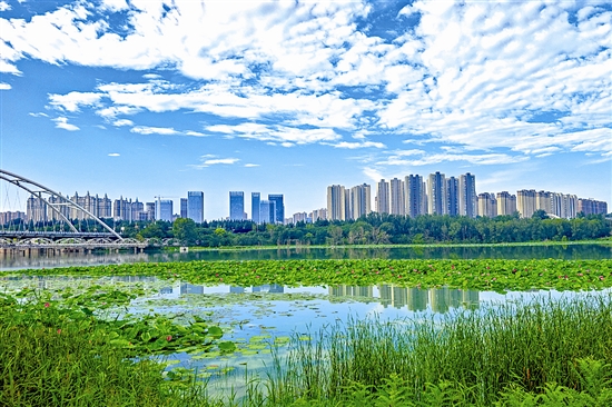 7月7日,三门峡天鹅湖国家城市湿地公园风景如画。蓝天白云,澄澈湖面,荷叶层层叠叠,荷花点缀其中摇曳生姿。葱郁草木沿湖岸蓬勃生长,对岸楼宇高耸林立,生态画卷,美不胜收。