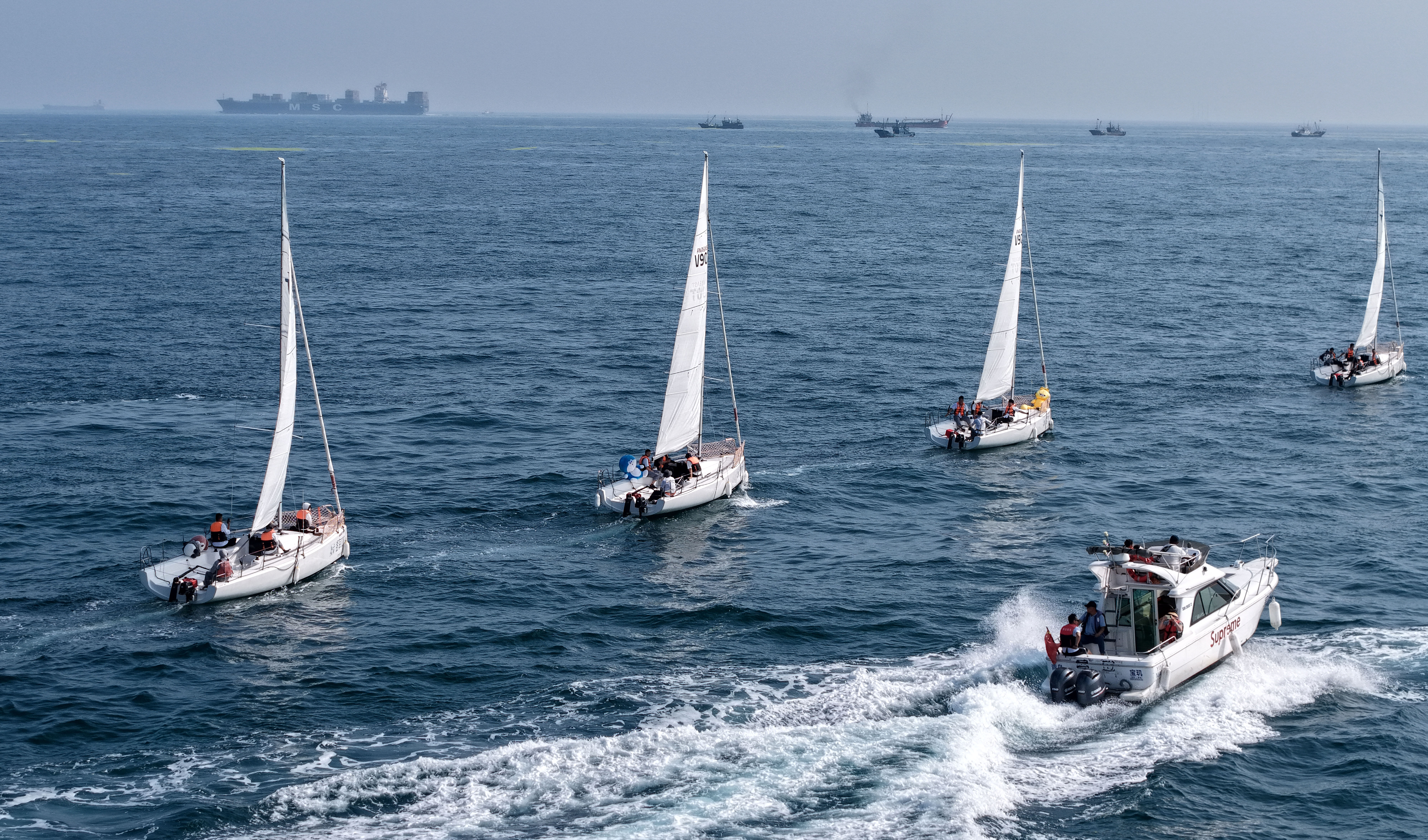 青岛老龙湾海域,市民和游客乘船参加海上巡游活动(7月10日摄)。为迎接中国航海日,青岛市举行“我们来航海”海上巡游活动。市民和游客受邀乘坐帆船、游艇出海,体验海洋文化的魅力。2025年是中国航海日设立20周年,也是郑和下西洋620年。今年航海日活动以“绿色航海 向新图强”为主题。