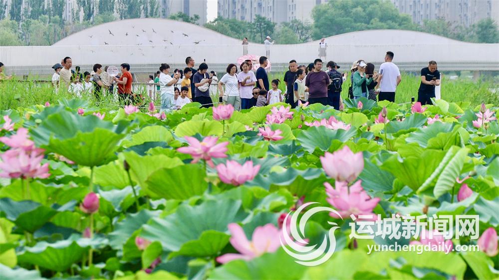 樊先生一家三口从尧梦公园北入口进入,顺着步道前行。公园内人流如织,原本宽阔的道路被来往游客挤得满满当当,竟然显得有些窄细。空气中蒸腾着草木清香、汗味与不知何处飘来的小吃香味,孩子们追逐嬉闹,老人们坐在石凳上摇着蒲扇,年轻人打着羽毛球、乒乓球、排球等,场面十分热闹。来到荷花池前,满池荷花竞相绽放,清香四溢,樊先生赶紧找好角度给家人拍了几张照片。