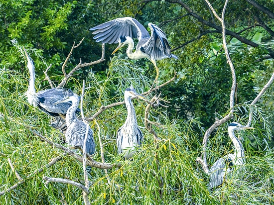 每年春季白天鹅回迁后,还有灰鹤等珍稀鸟类选择在天鹅湖栖息,这里已成为名副其实的鸟类天堂。近年来,我市扎实推进生态修复工作,野生鸟类种类从175种增加到300种左右,生物多样性位居中西部地区前列。