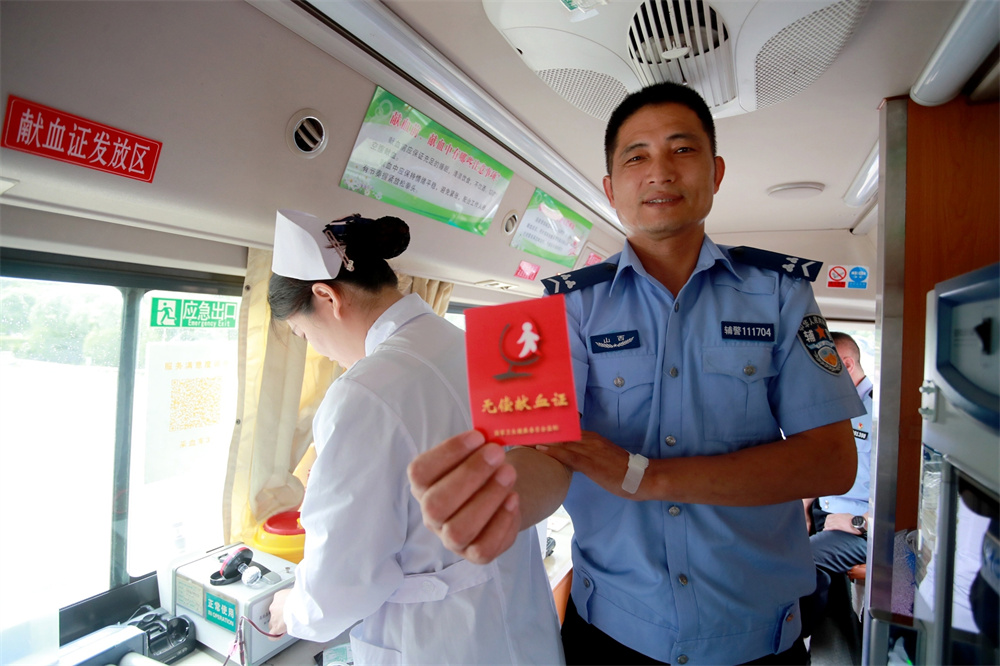 图为参与无偿献血活动的民警手持无偿献血证。 葛崇收 摄