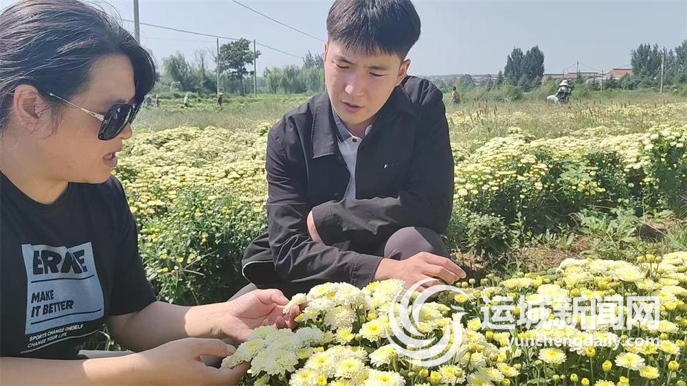万荣县解店镇到村工作大学生与村干部查看菊花长势。 (资料照片)