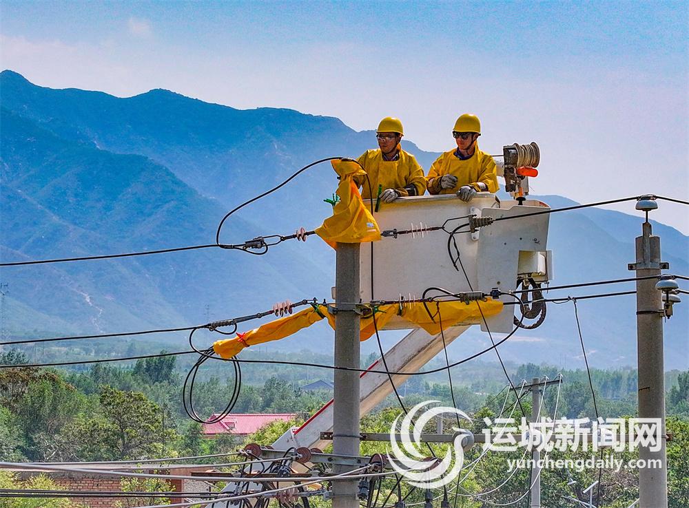 7月17日,在盐湖区解州镇蚕坊村,国网盐湖区供电公司员工在高温下带电作业。
