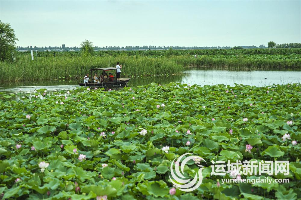 7月20日,在永济市韩阳镇黄河滩万亩鱼莲混养示范基地,碧绿的荷叶与粉红娇艳的荷花相映成趣,美不胜收,吸引不少游人前来观赏。