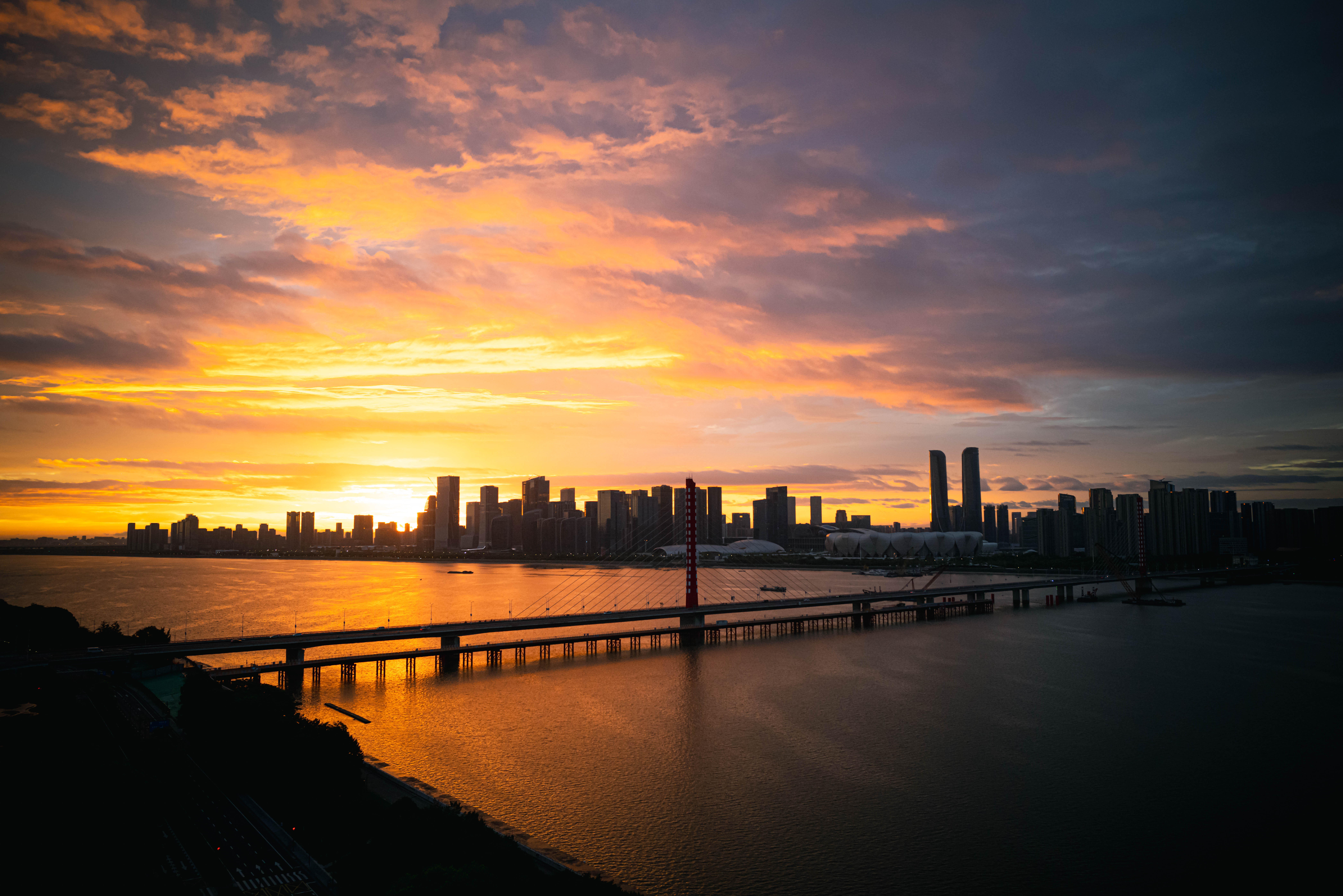 当日,在钱塘江畔,彩虹、城市、霞光共同勾绘了日出时分的美丽景色。