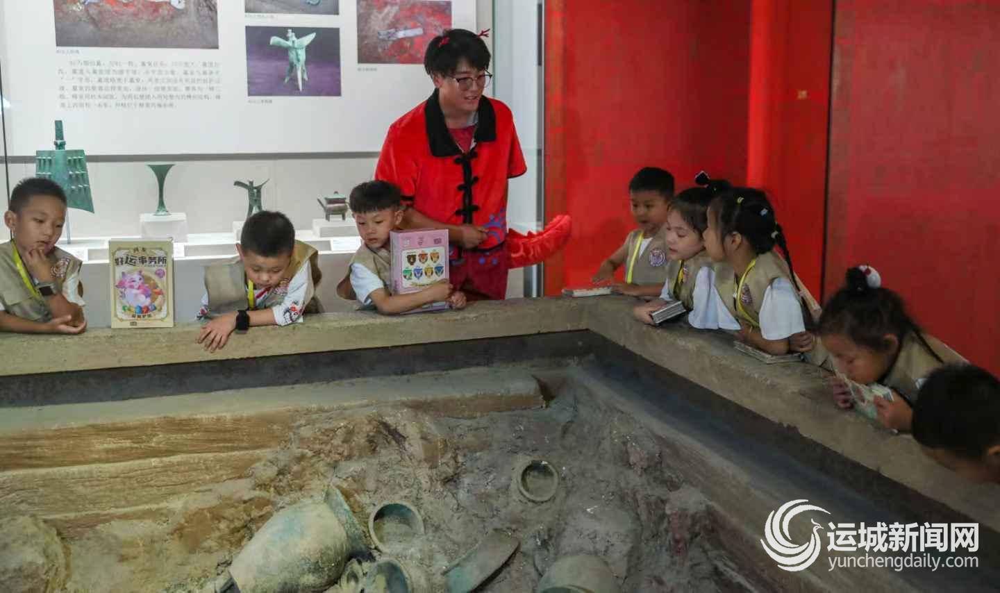 近日,在运城博物馆展厅内,研学老师在向孩子们讲解陈列文物背后的故事。