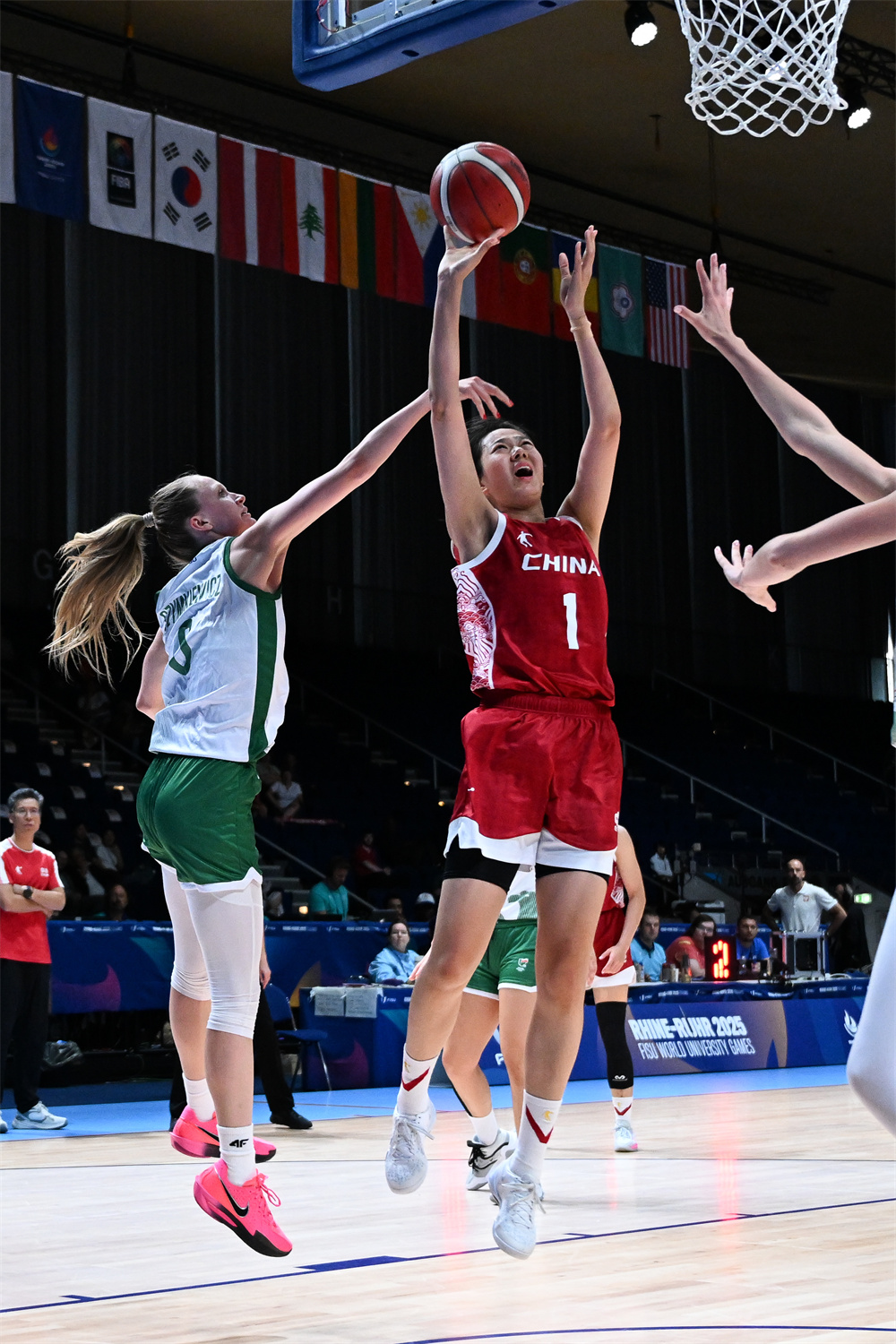 当日,在德国埃森举行的2025年莱茵-鲁尔世界大学生夏季运动会女子篮球半决赛中,中国队71比67战胜波兰队,晋级决赛。 新华社记者 连漪 摄