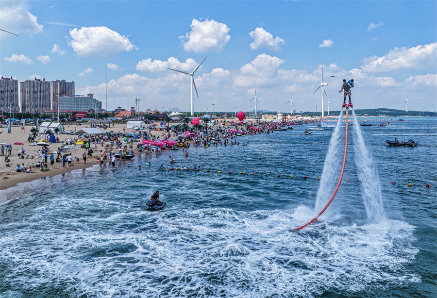 7月24日,游客在山东省荣成市那香海国际旅游度假区体验“水上飞人”。