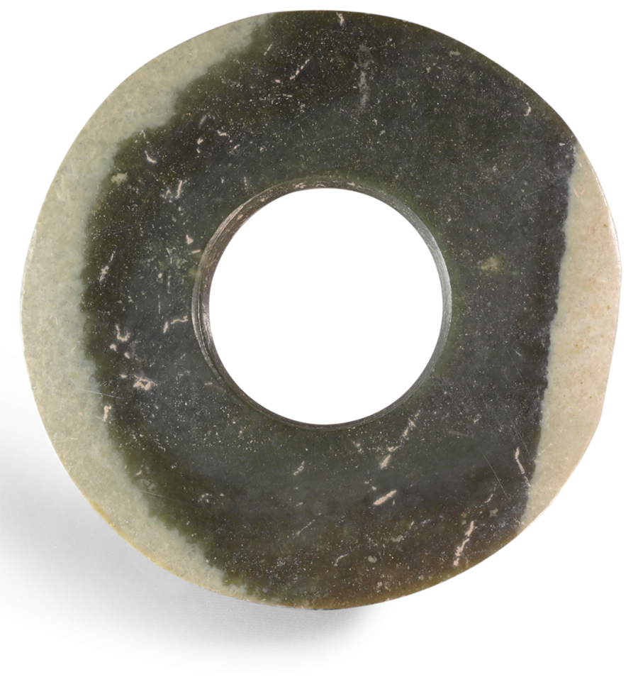 俗话说:“玉不琢,不成器。”这件青玉环中间的喇叭状钻孔,也向我们直观地展现当时的工艺水平。在龙山文化时期,玉器的制作已经达到了相当高的水平。工匠们不仅掌握了玉石的开采和加工技术,还能够根据不同的用途和需求,设计出各种精美的玉器。这件青玉环的喇叭状钻孔设计,不仅增加了玉环的美观度,还可能具有一定的实用功能。例如,在祭祀活动中或者日常作为饰物佩戴时,这种钻孔可能用于穿绳佩戴,方便人们使用。这钻孔不仅是实用功能的体现,更像是远古工匠们留下的签名,见证着他们的创造力与对美的追求。